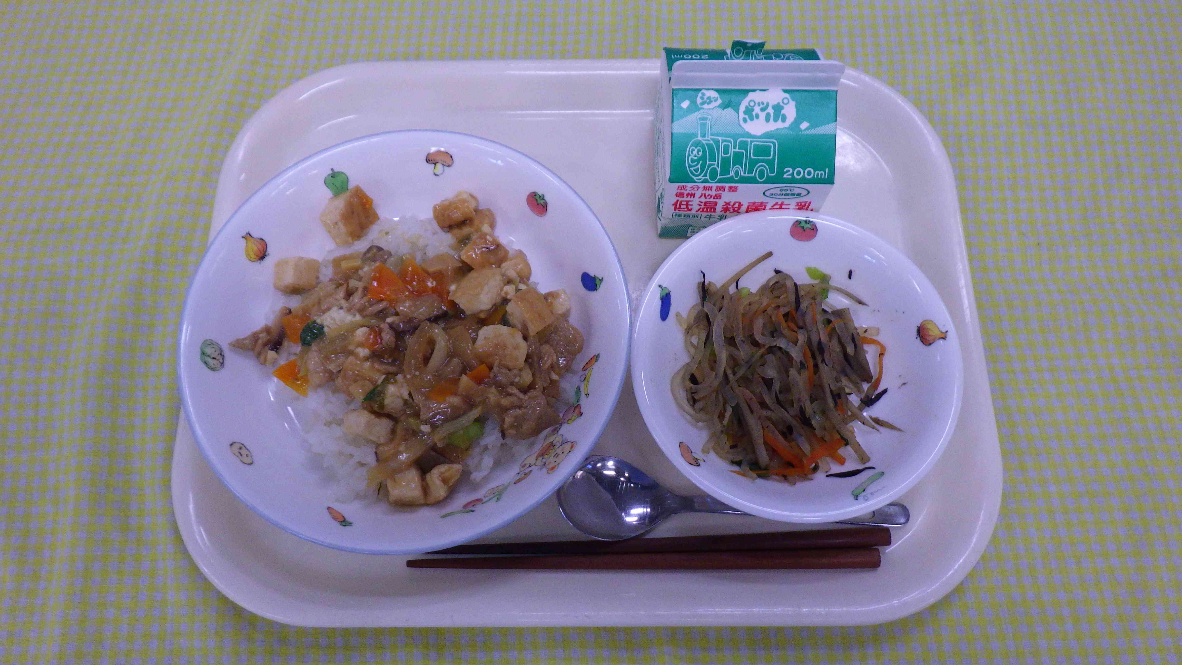 家常豆腐丼 こんにゃくの炒め物 牛乳