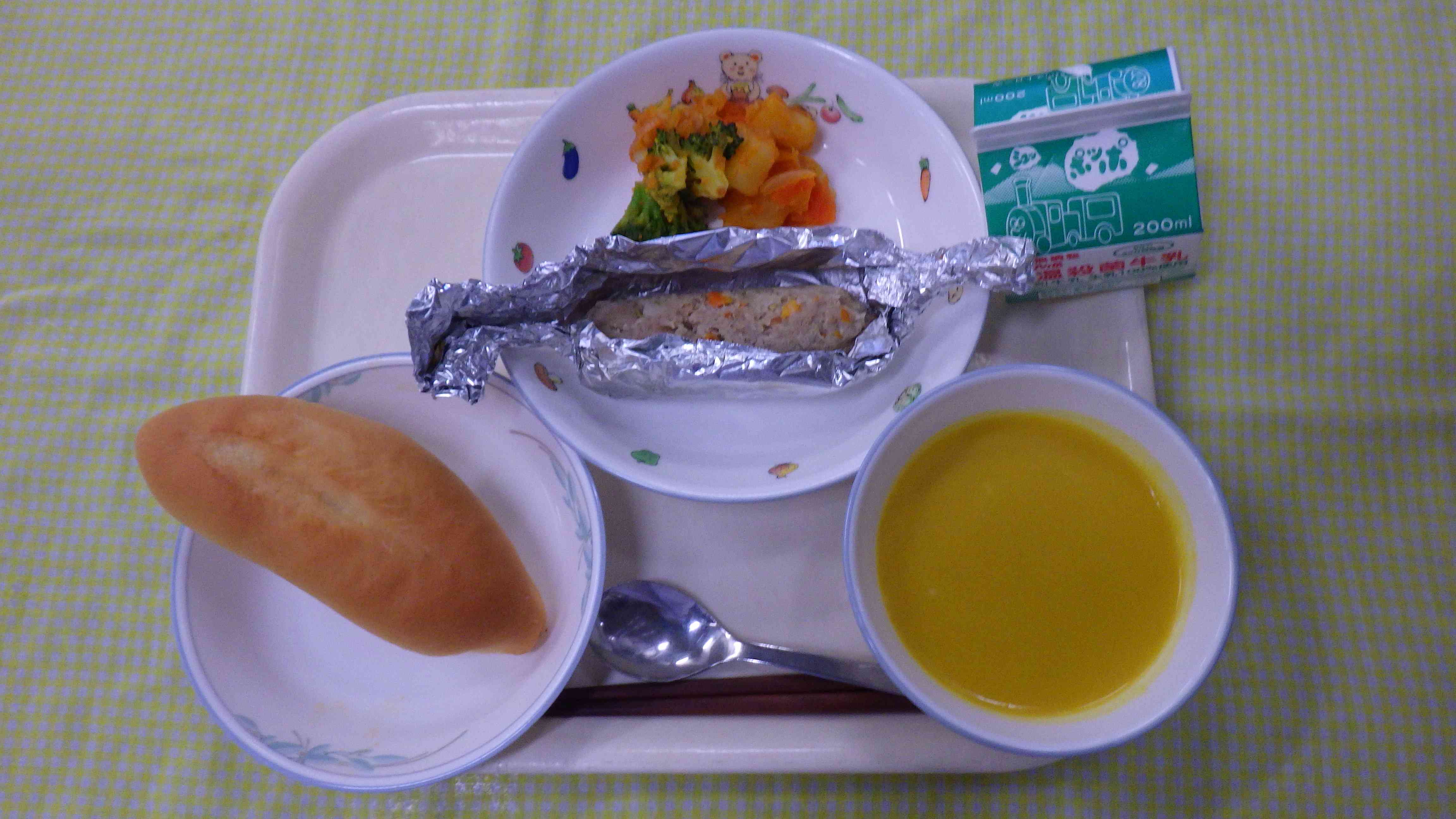 ソフトフランスパン かぼちゃとコーンのスープ 手作りソーセージ ジャーマンポテト 牛乳