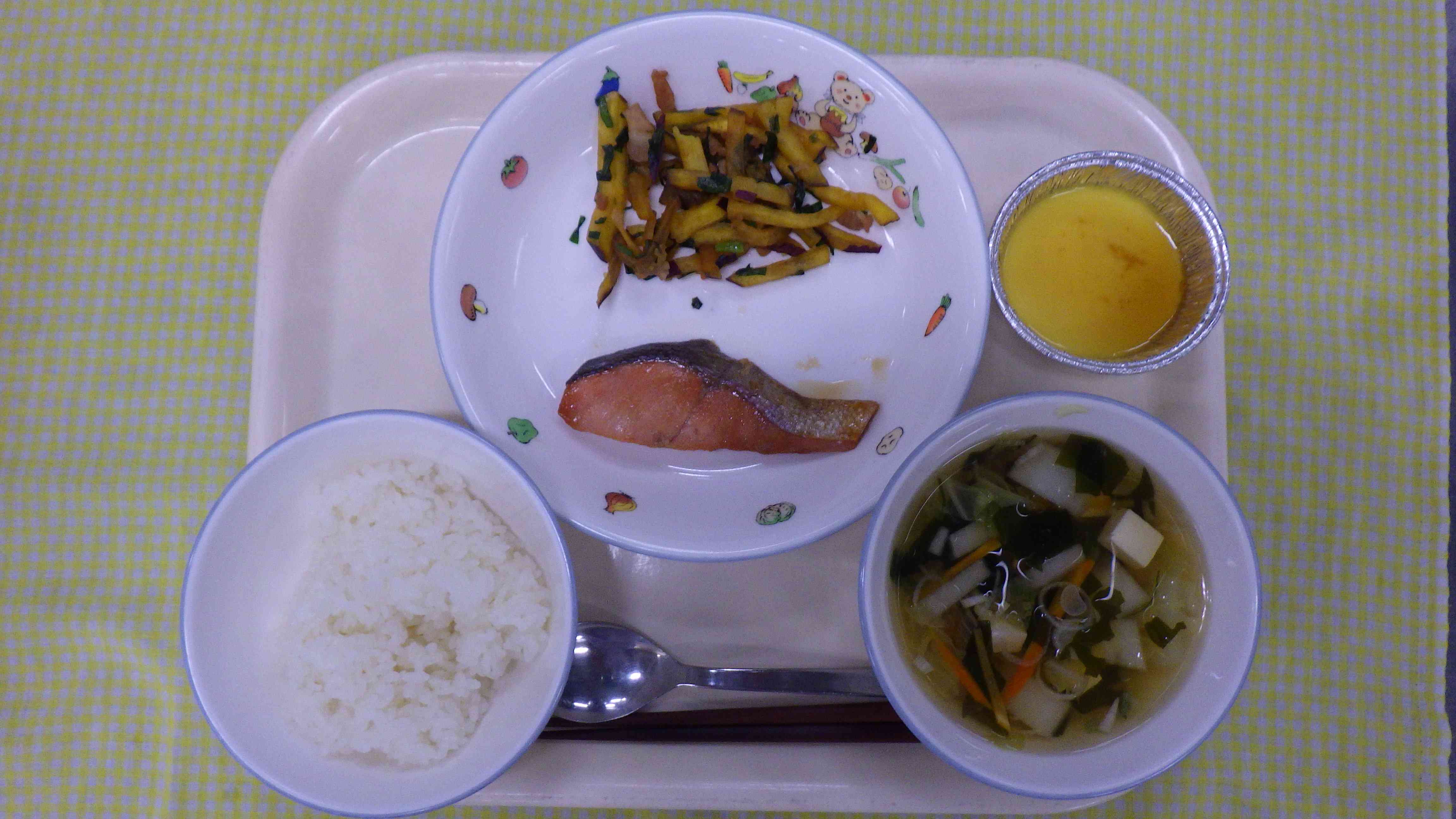 ごはん すまし汁 鮭の照り焼き さつま芋のピリ辛きんぴら プリン