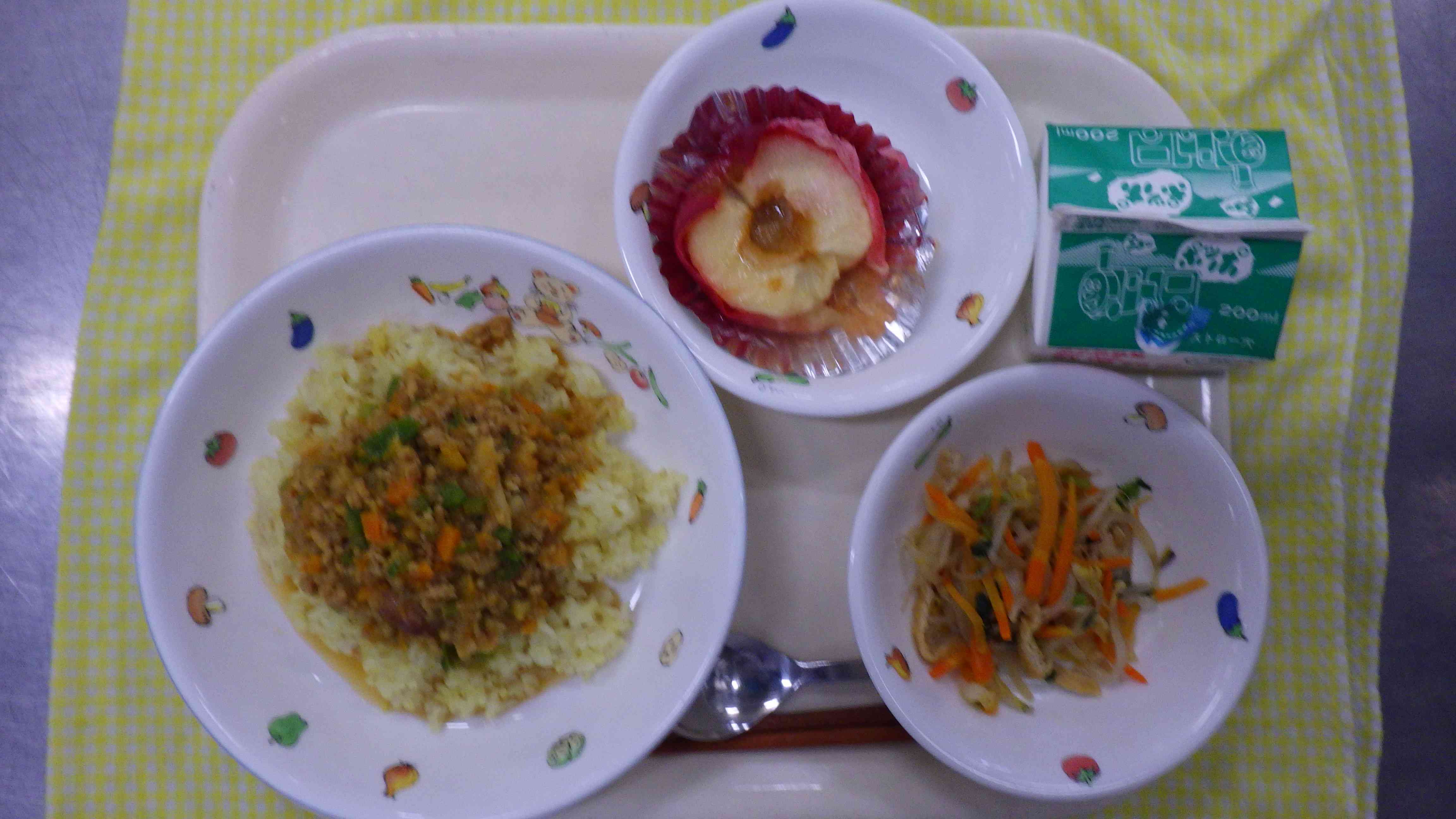 根菜たっぷりドライカレー 野菜ソテー 焼きりんご 牛乳