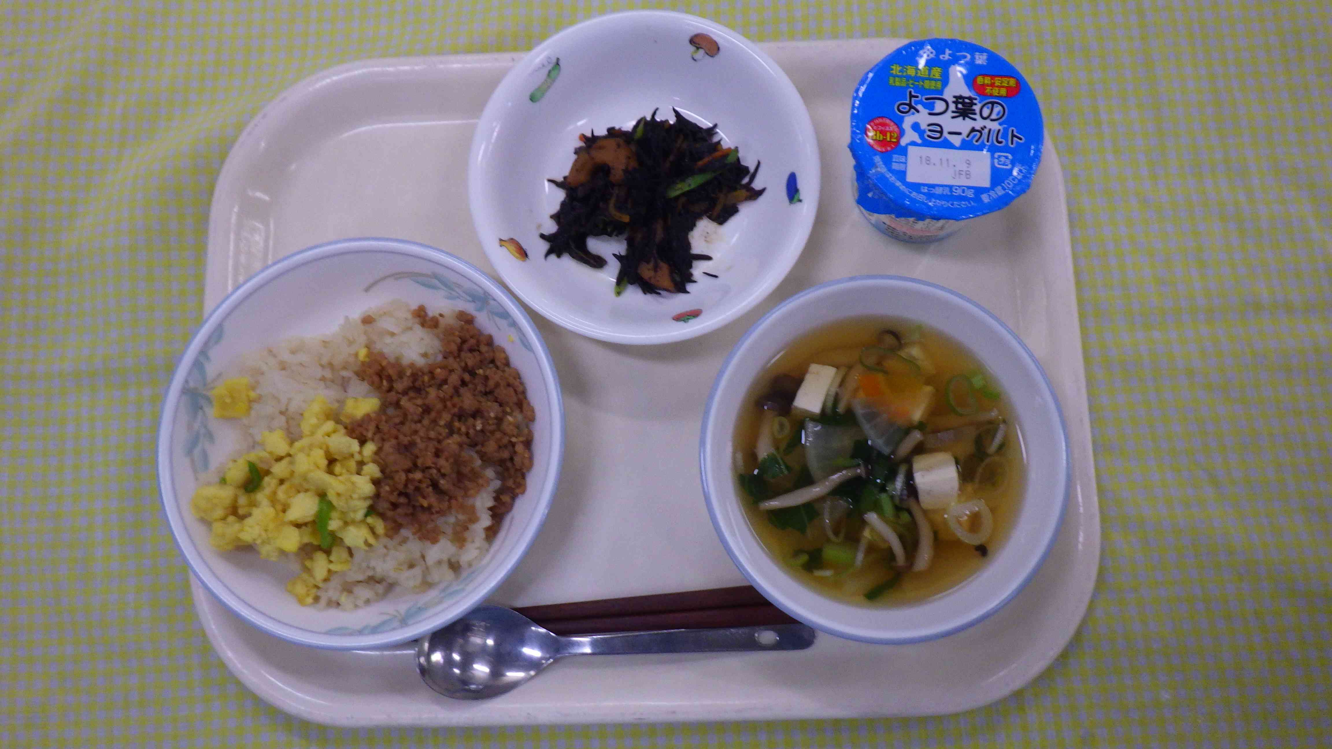 二色ごはん 実だくさん汁 ひじきの煮物 ヨーグルト