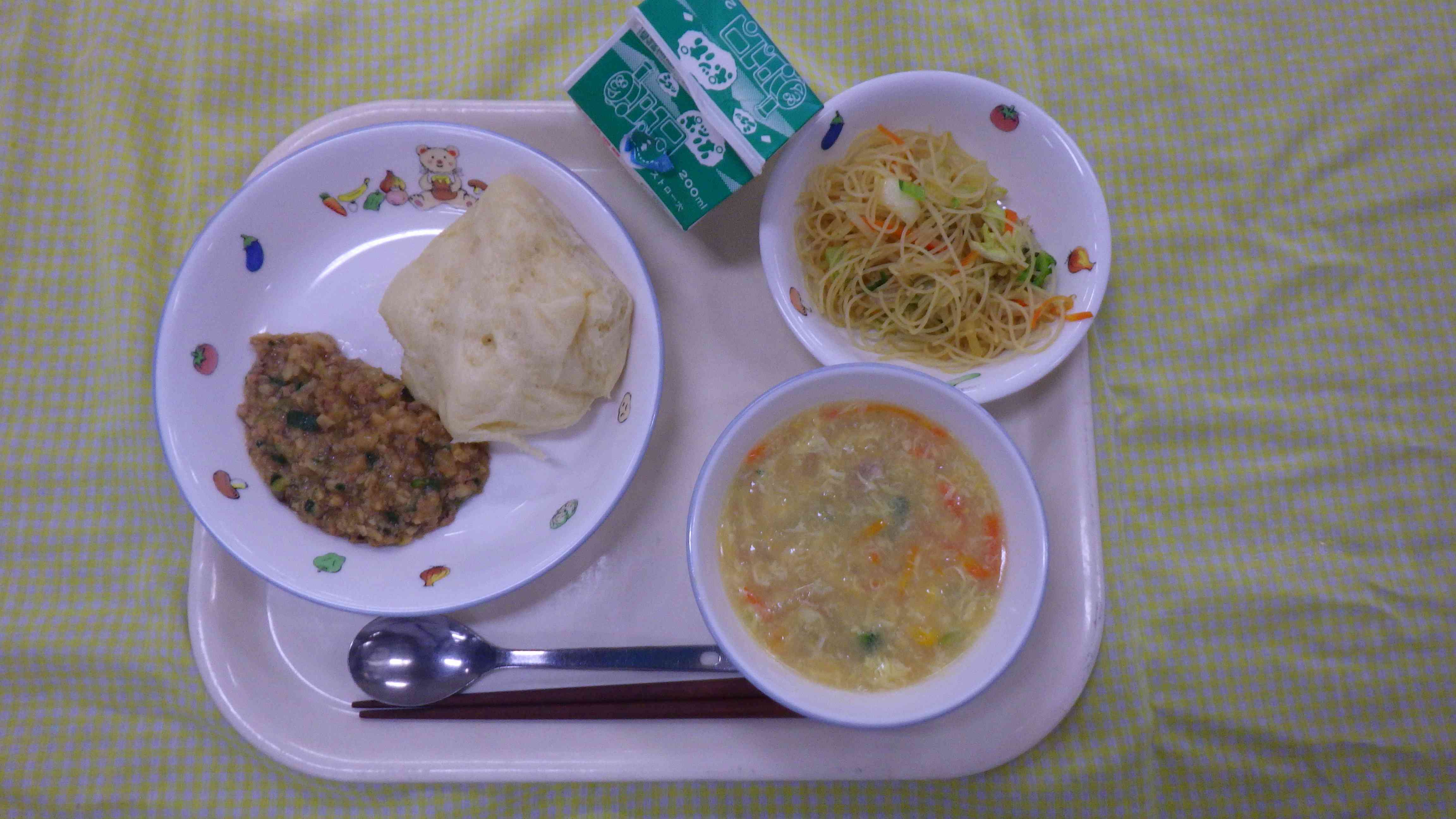 豆乳入り花巻 肉みそ 卵とコーンのスープ カレービーフンソテー 牛乳