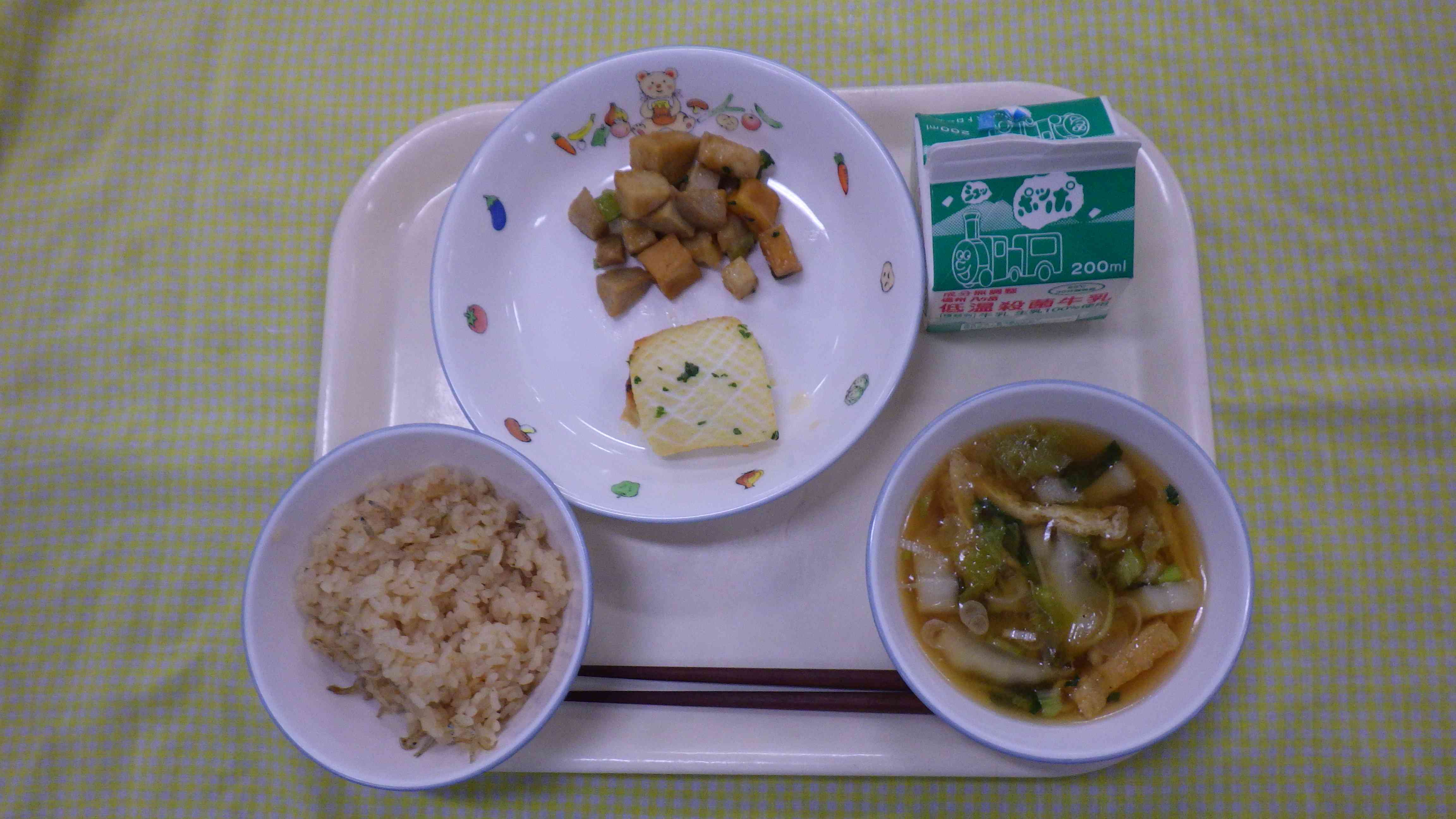 梅干しとじゃこのごはん みそ汁 いかのガーリック焼き 里芋と高野豆腐と揚げ煮 牛乳