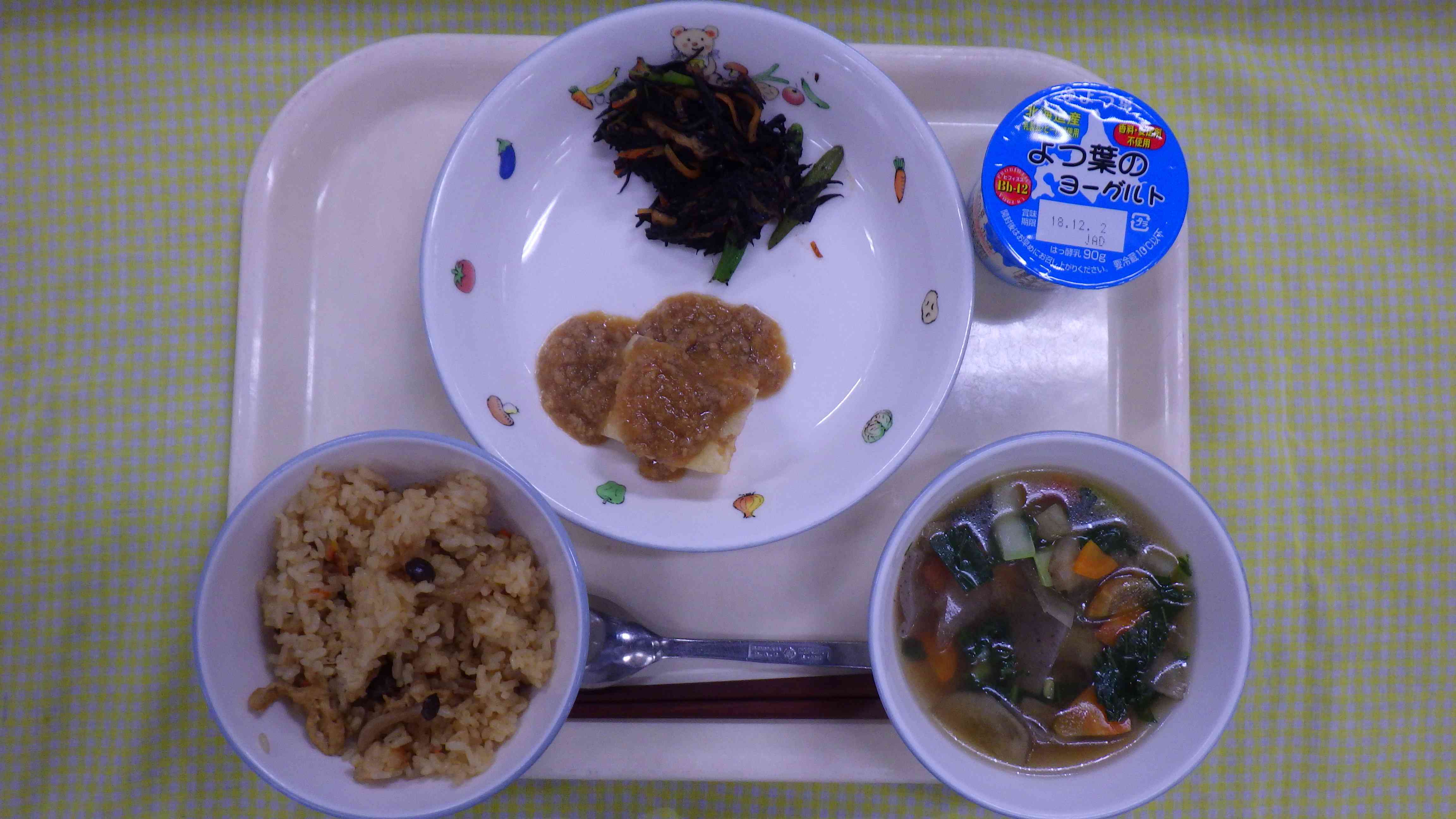 しめじごはん けんちん汁 揚げ豆腐みそ田楽 ひじきの煮物 ヨーグルト
