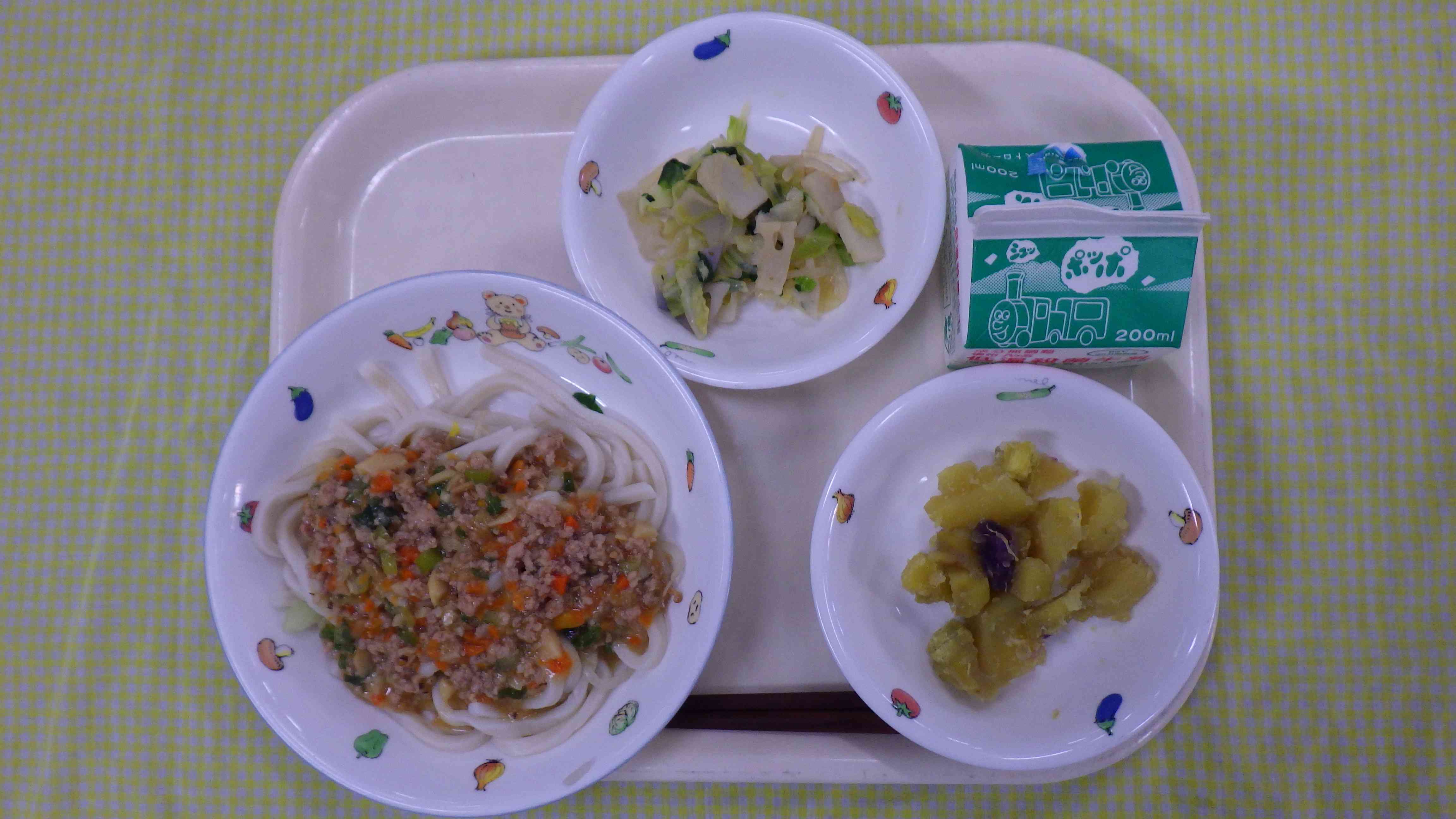 ゆでうどん肉みそあんかけ さつま芋の甘煮 野菜のオイスター炒め 牛乳