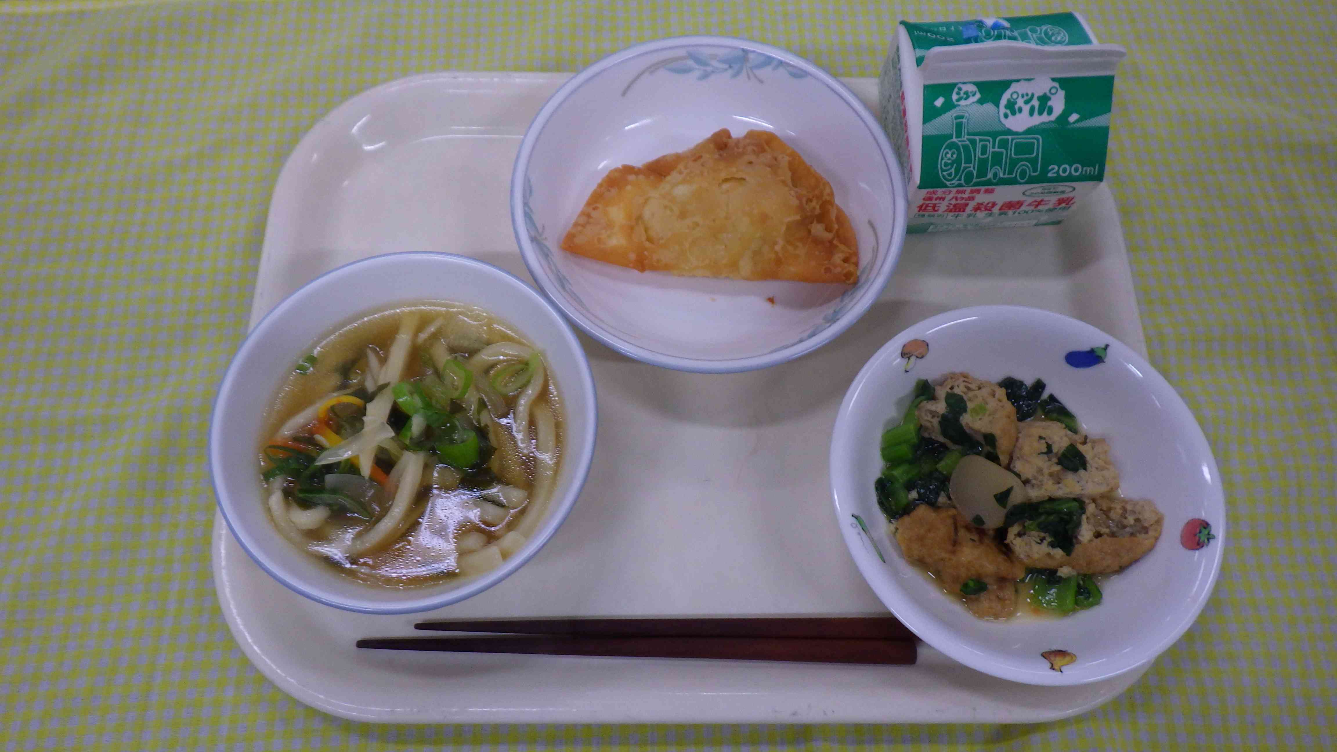 わかめうどん がんもどきとこんにゃくの煮物 さつま芋とチーズの包み揚げ 牛乳