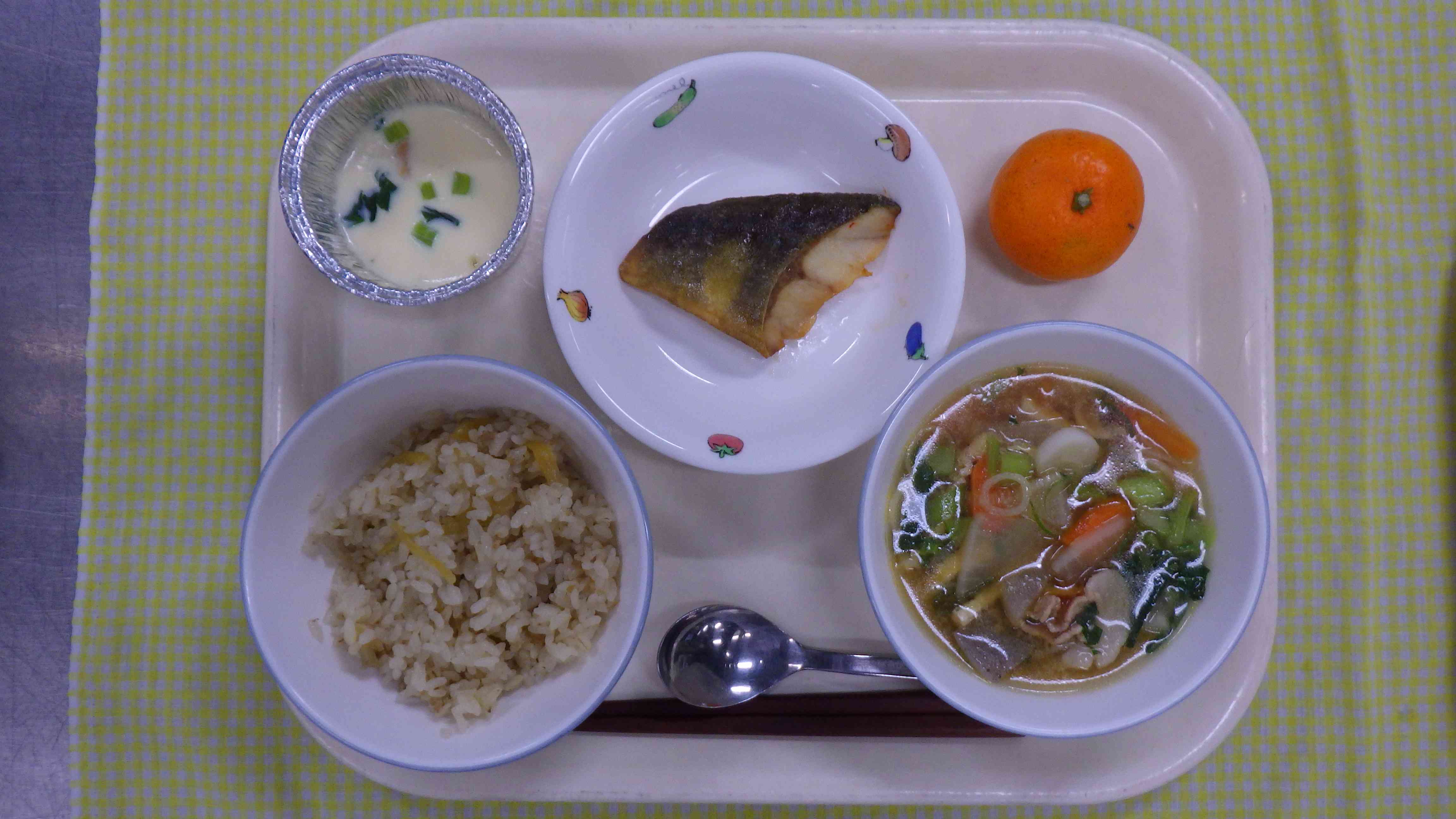 ヤーコンごはん 豚汁 ほっけの香味焼き 茶碗蒸し みかん