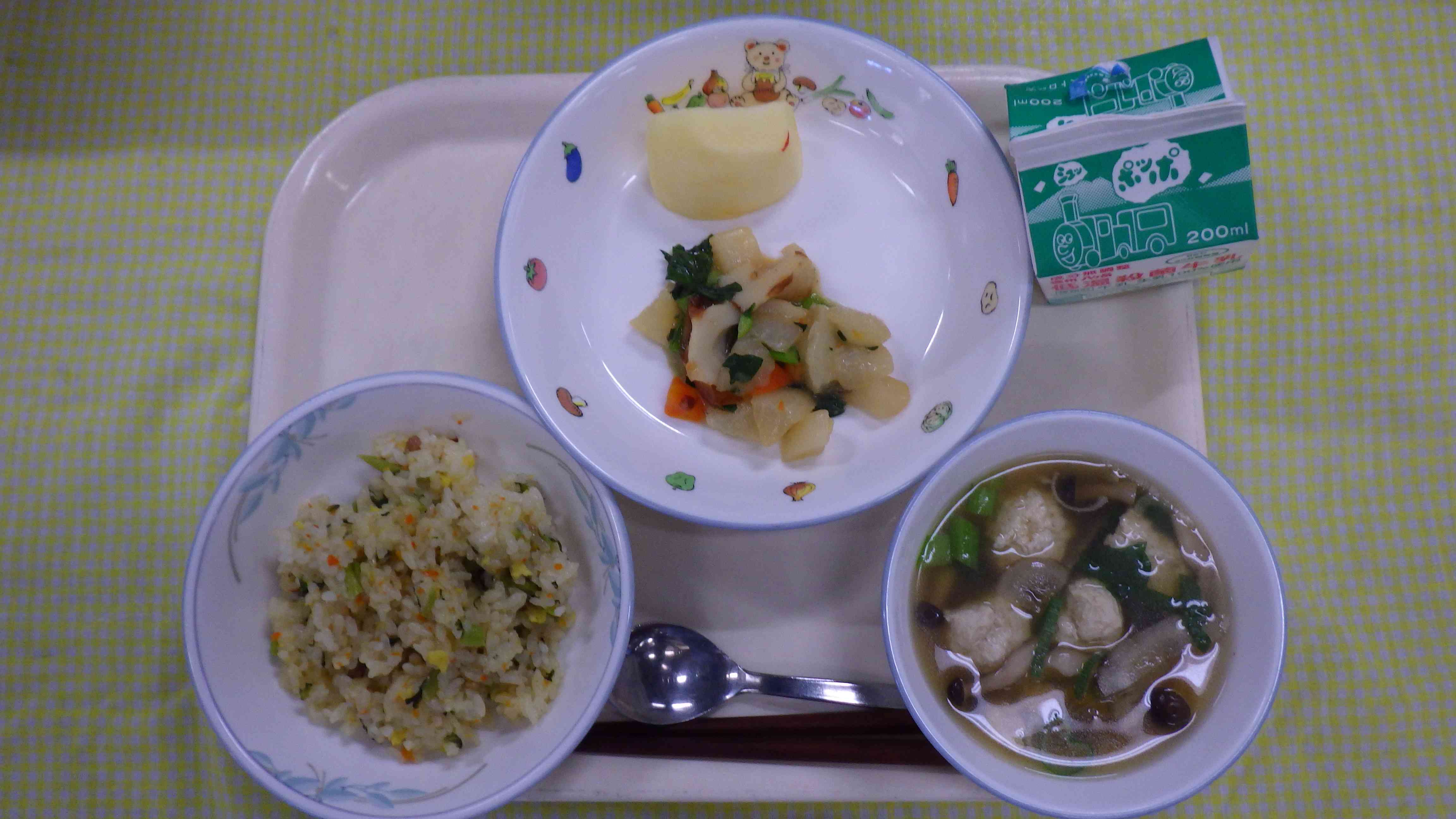 野沢菜チャーハン 豆腐団子スープ 大根と竹輪の炒め煮 りんご 牛乳