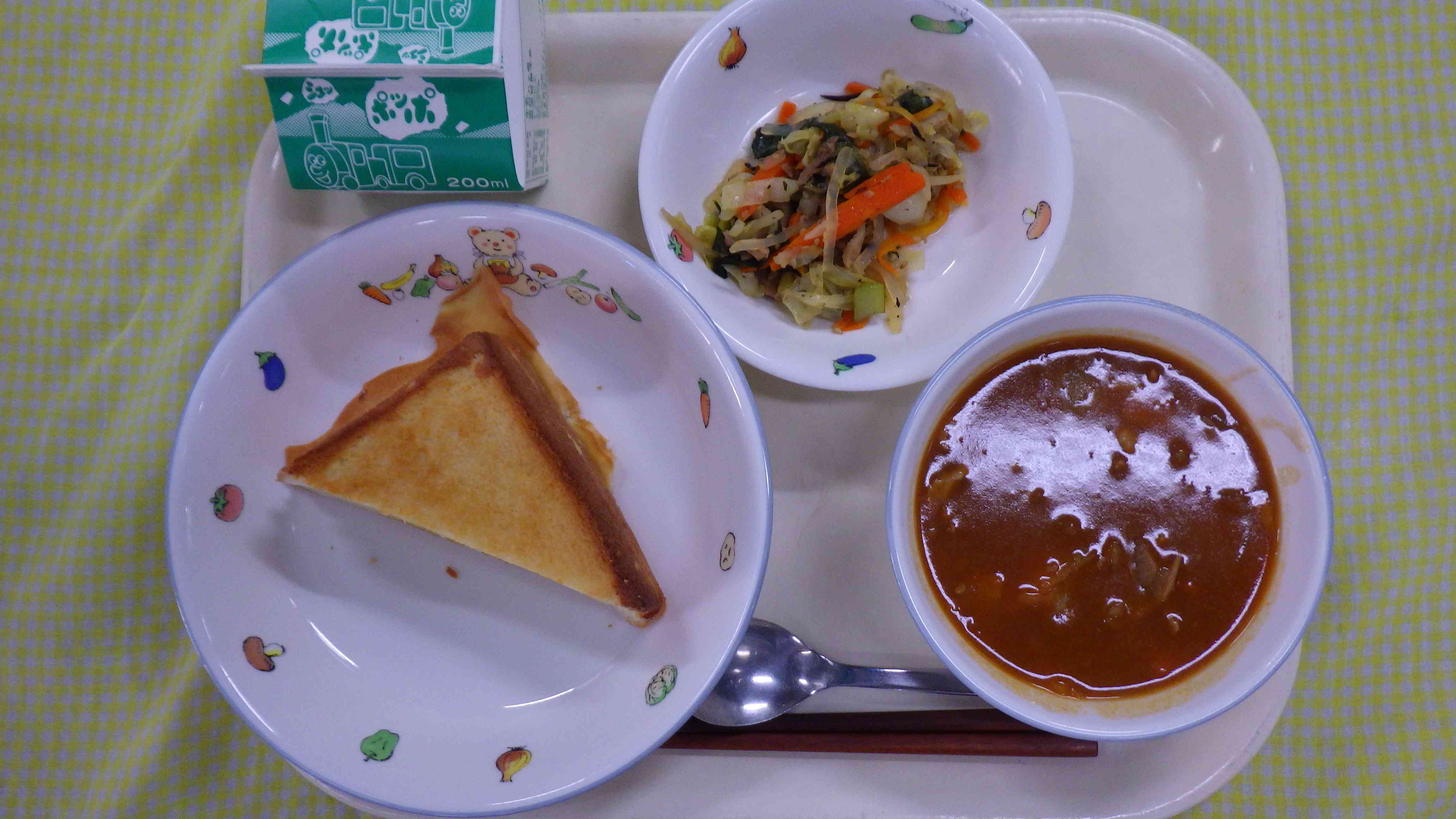 スイートポテトサンド トマトシチュー 中華温サラダ 牛乳