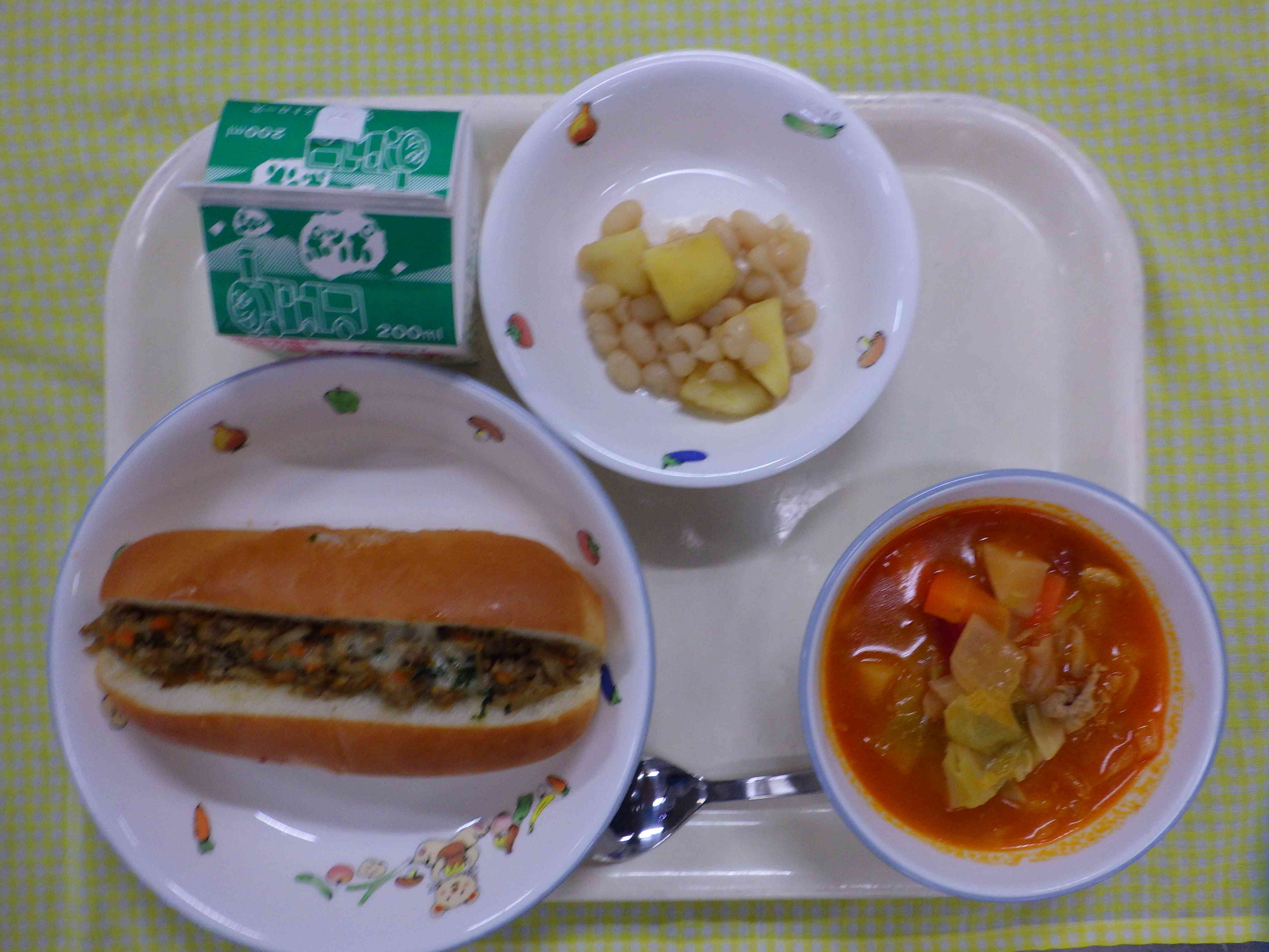 コリコリミートホットサンド ボルシチ 白いんげん豆とりんごの甘煮 牛乳