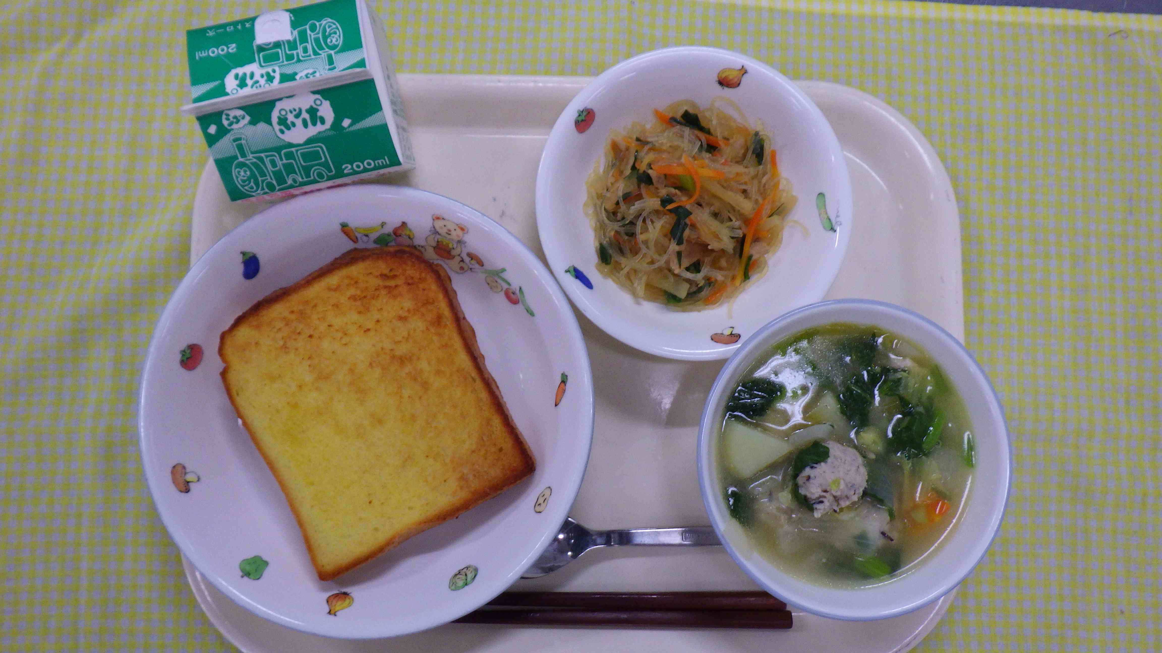 フレンチトースト 肉ボールスープ 春雨と大根のピリカラ炒め 牛乳