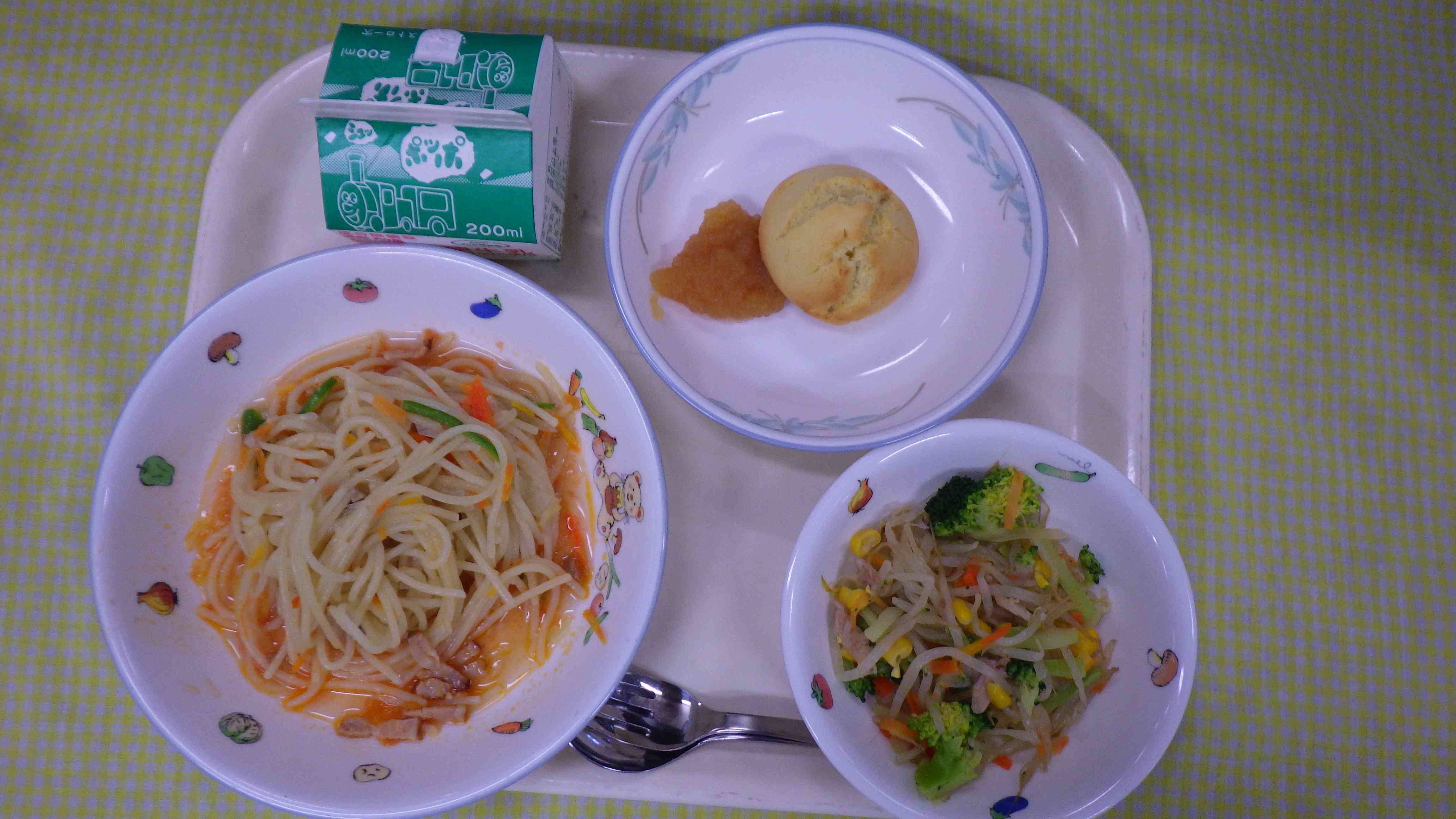 スープスパゲティ 野菜炒め 高野豆腐のスコーン りんごジャム添え 牛乳