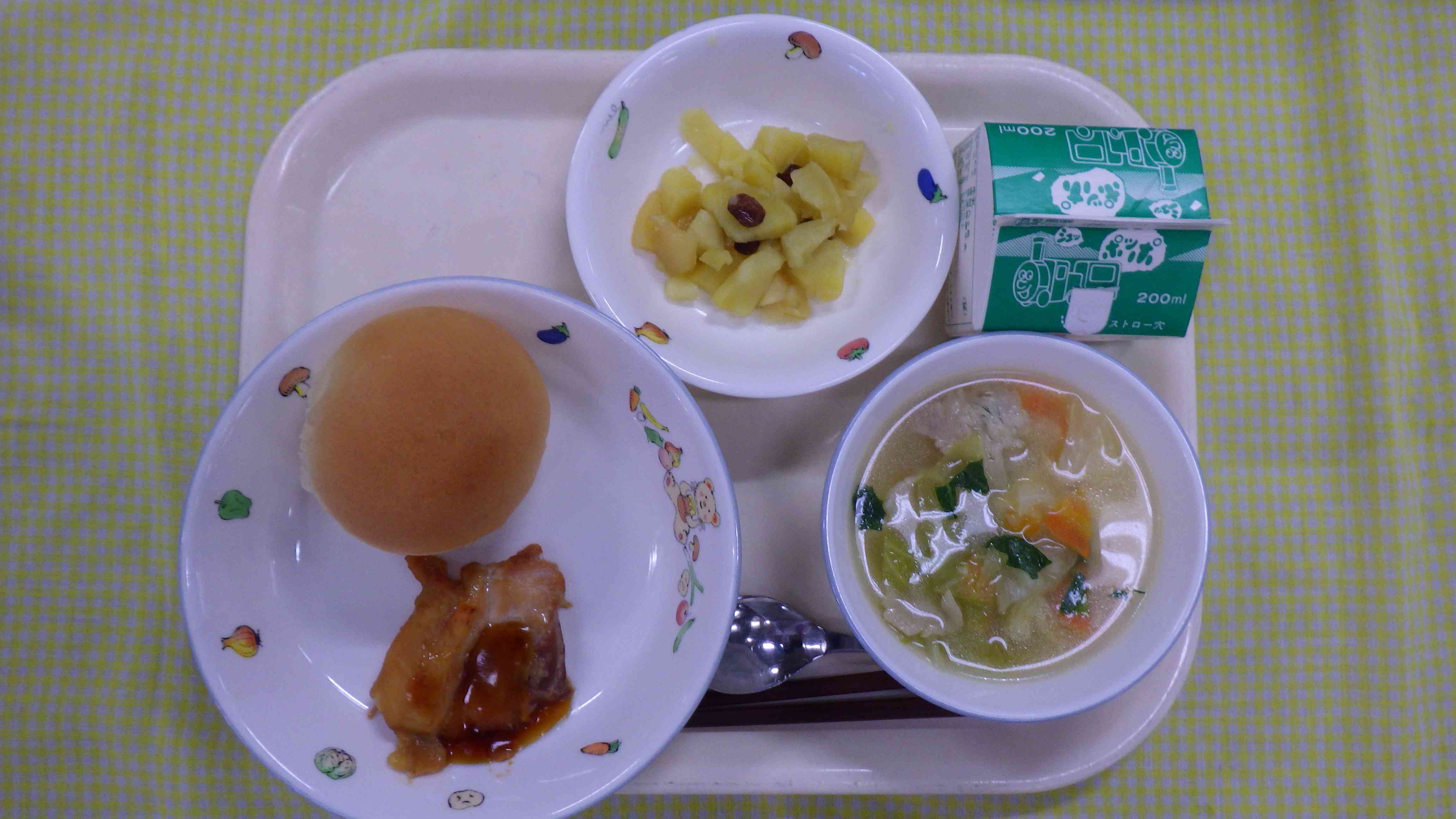 セルフサンド(照り焼きチキン) ABCスープ さつま芋りんごの重ね煮 牛乳