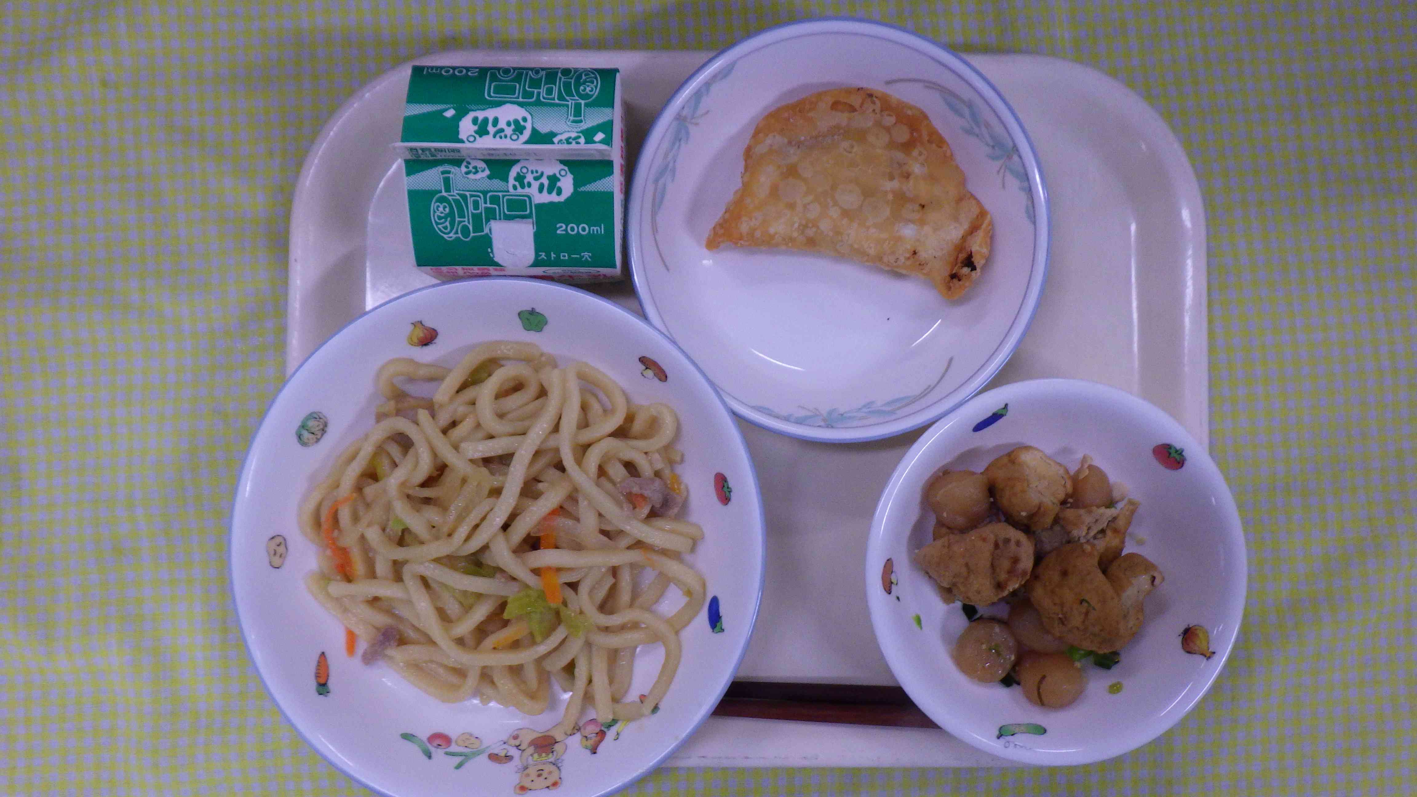 炒めうどん がんもどきとこんにゃくの煮物 じゃが芋とベーコンの包み揚げ 牛乳