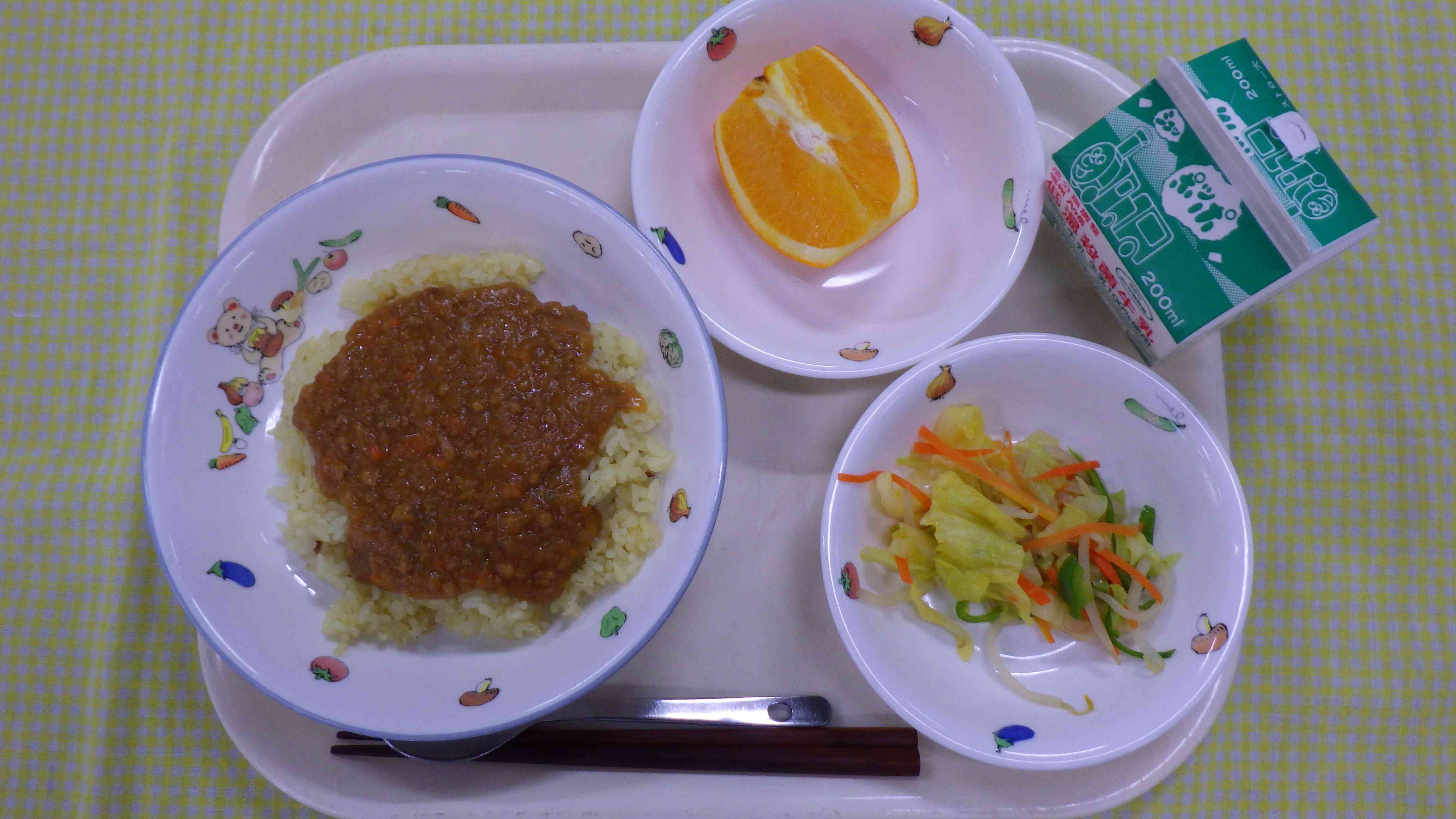 キーマーカレー 野菜ソテー ネーブル 牛乳