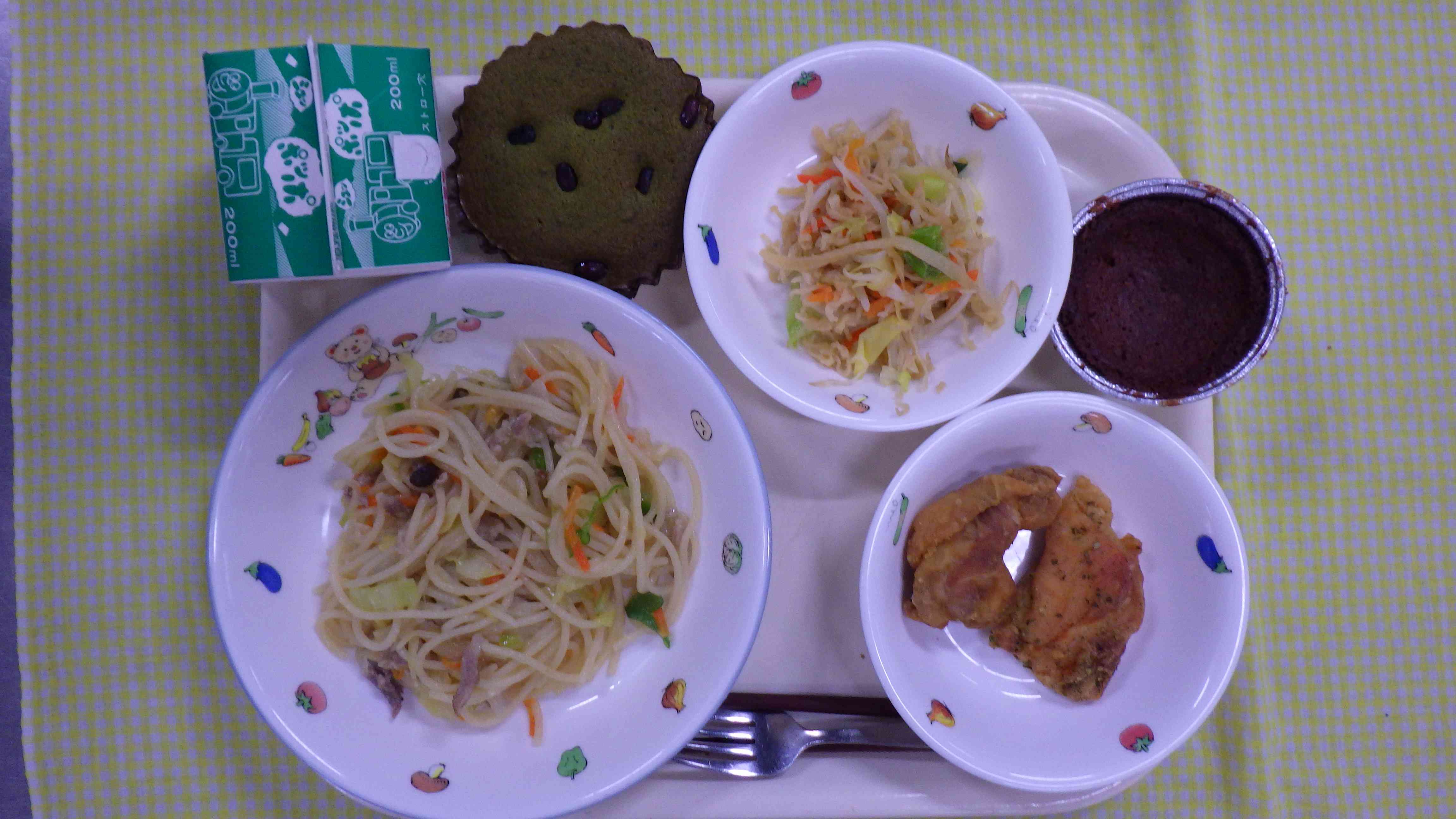★リザーブ給食★ 和風スパゲティ 鶏のカレー揚げまたは鶏の磯辺揚げ 切り干し大根の炒め物 八丈島の明日葉パンケーキまたはチョコレートケーキ 牛乳
