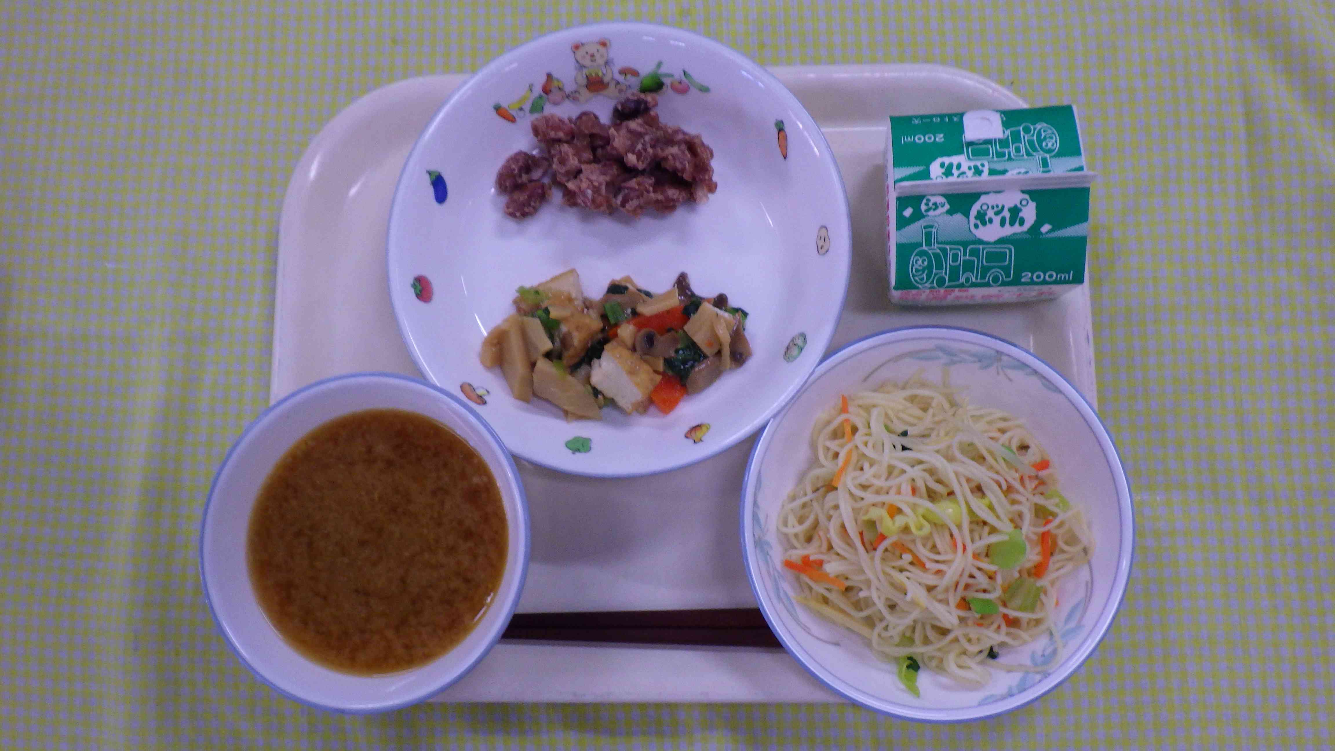 みそつけめん 生揚げの煮物 金時豆の甘煮 牛乳