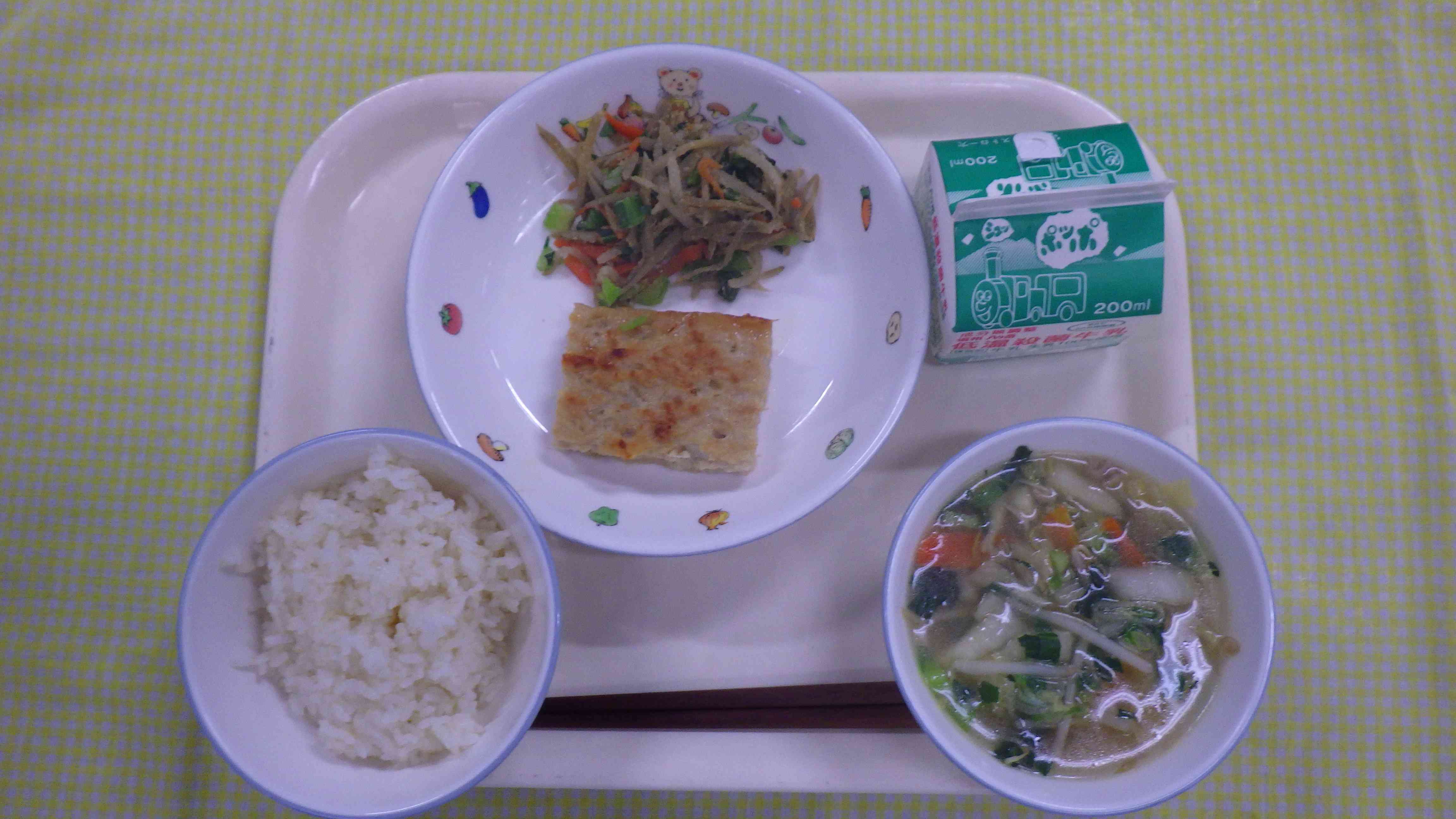 ごはん 香味スープ うどのつくね焼き ごぼうの温野菜 牛乳