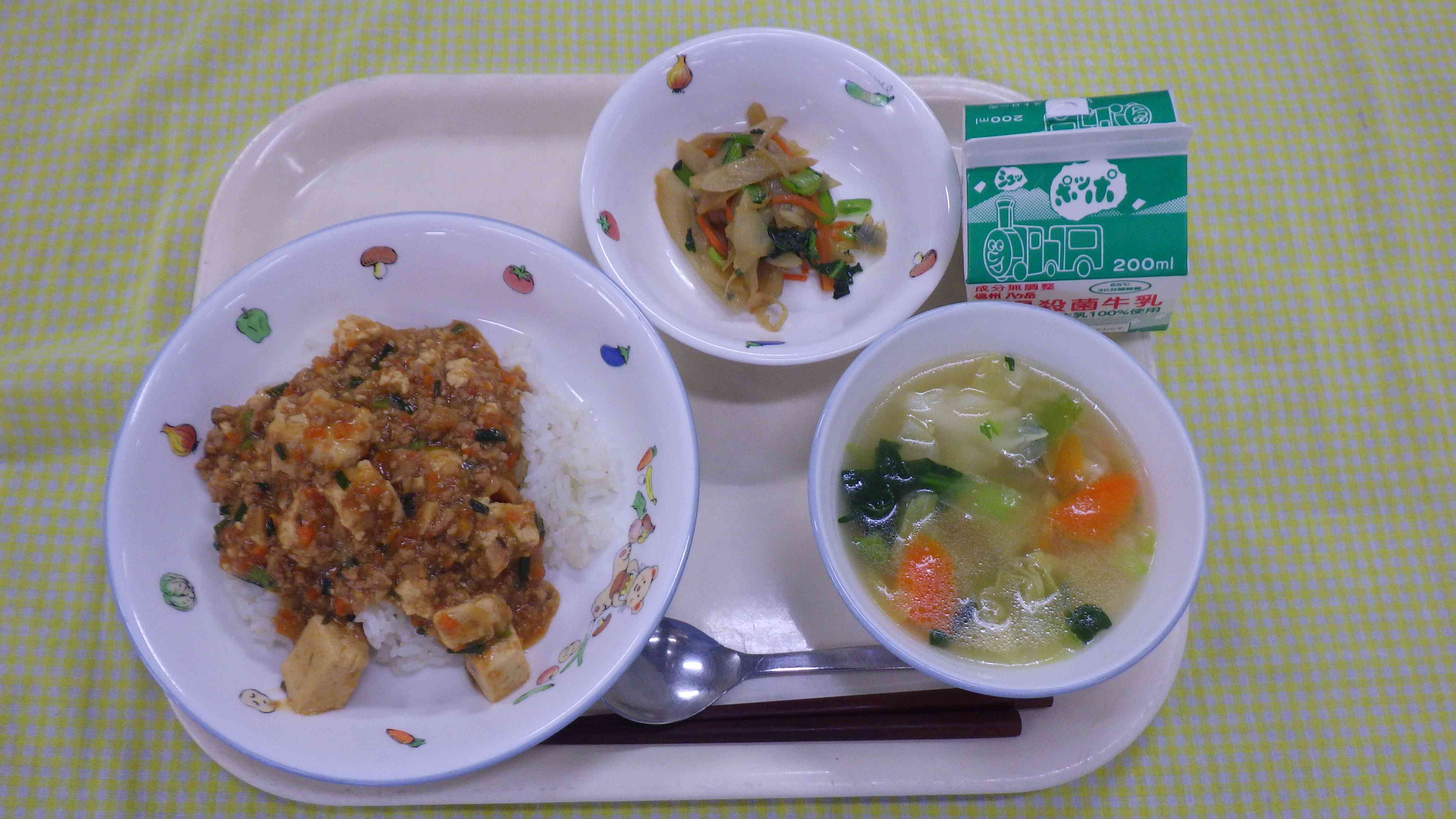 マーボー豆腐丼 野菜スープ うどのきんぴら 牛乳