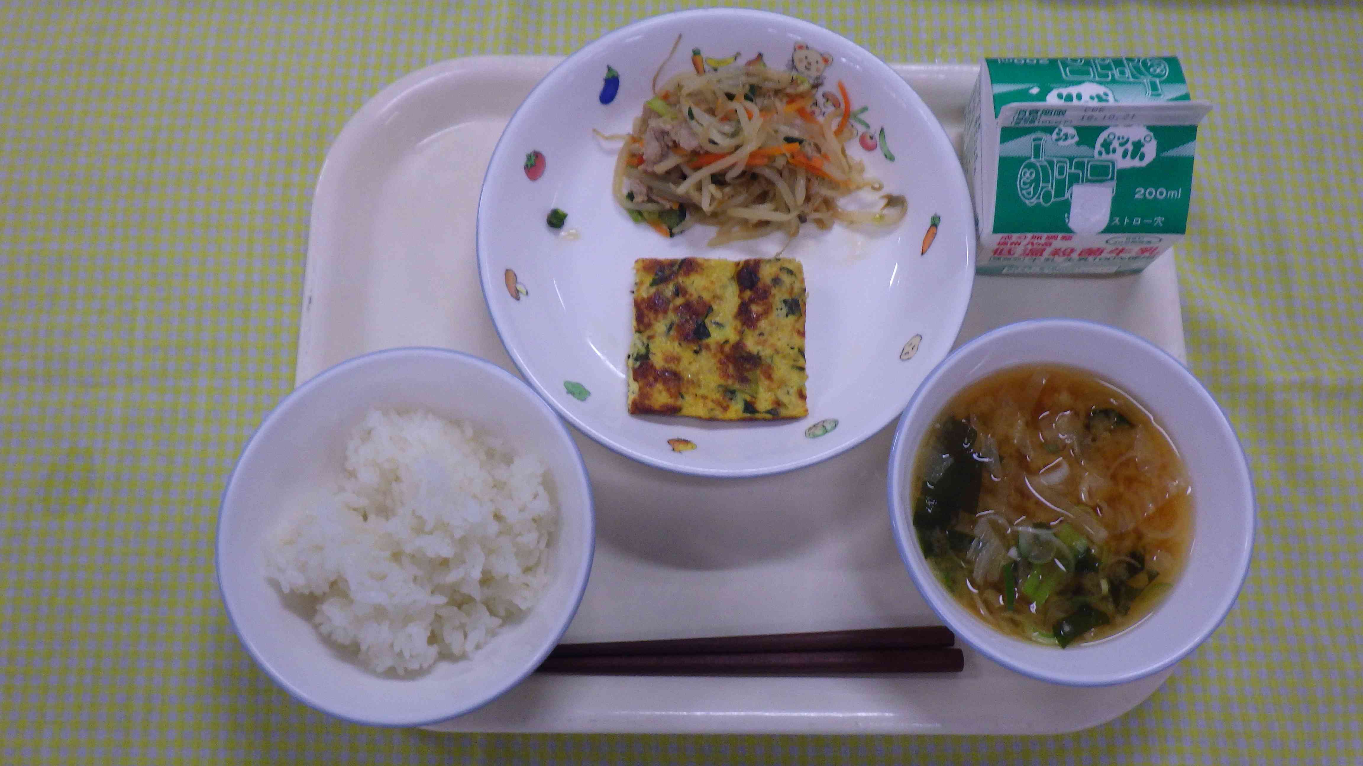 ご飯 みそ汁 ツナの厚焼き卵 野菜炒め 牛乳