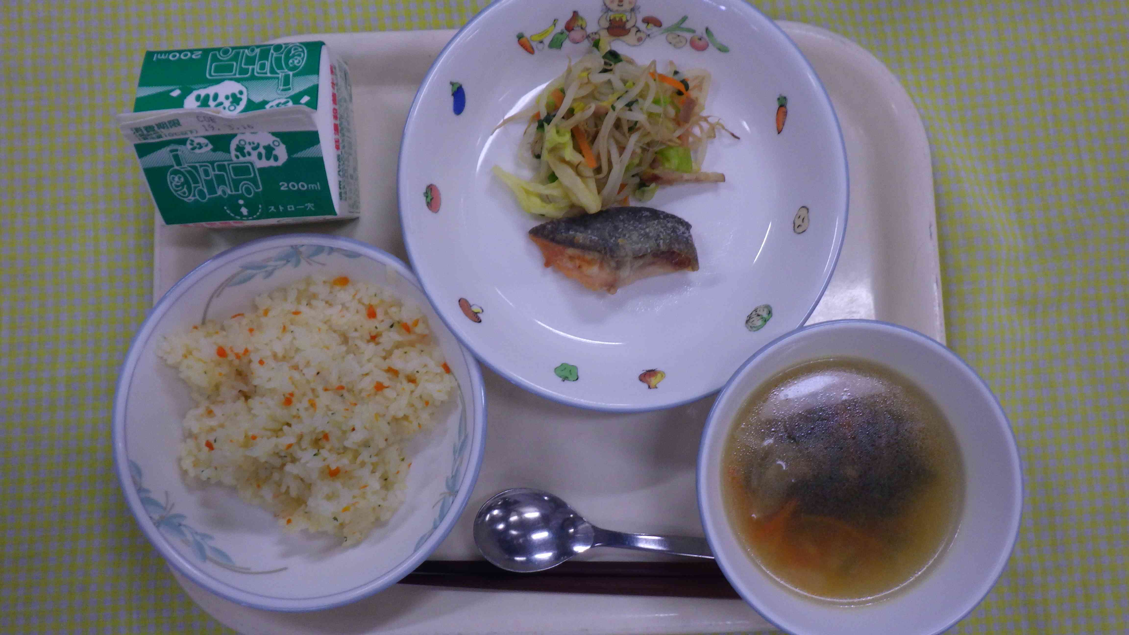 にんにくライス わかめスープ 鮭のムニエル 野菜ソテー 牛乳