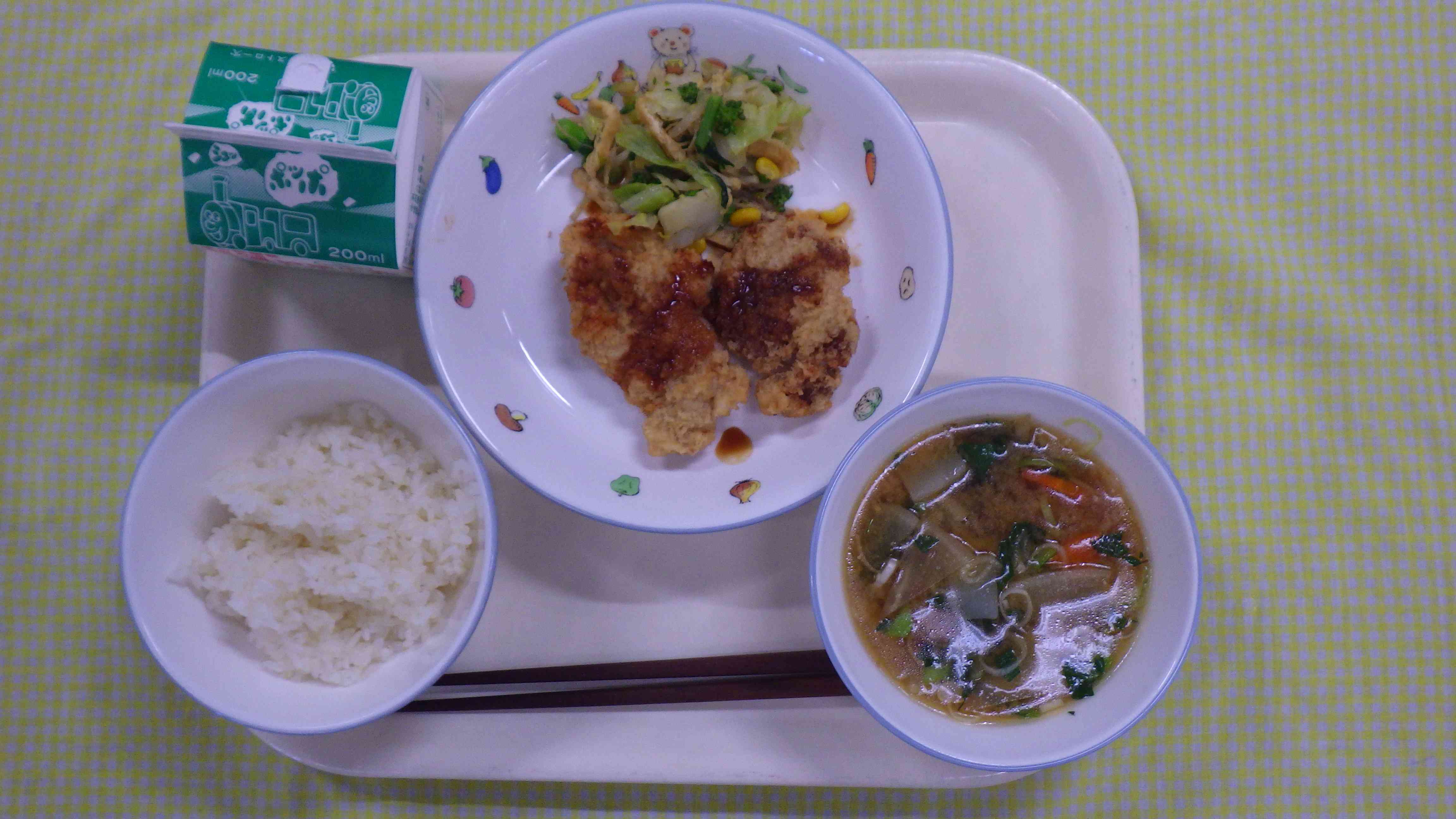 ごはん 実だくさんみそ汁 ヒレカツ 野菜炒め 牛乳