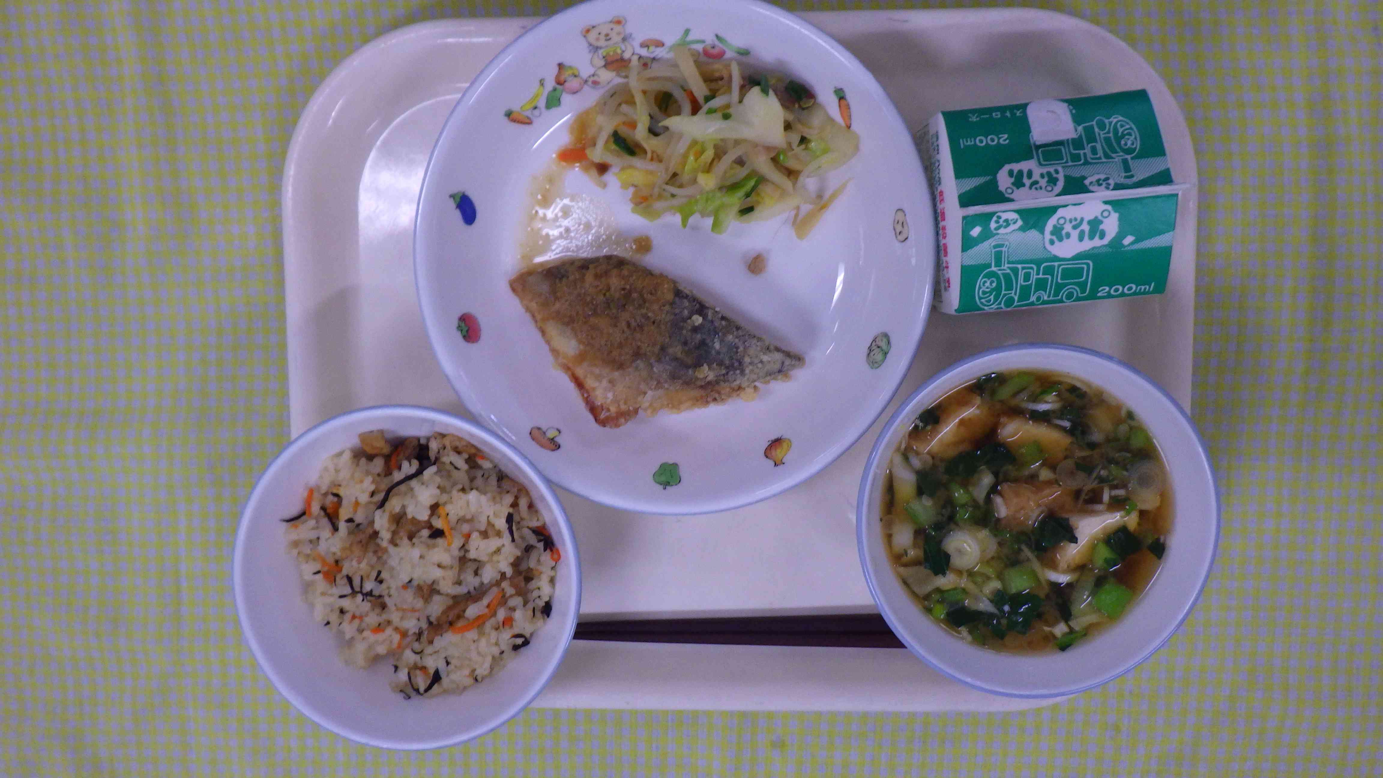 ひじきごはん 生揚げのみそ汁 さばのねぎソース 野菜ソテー 牛乳