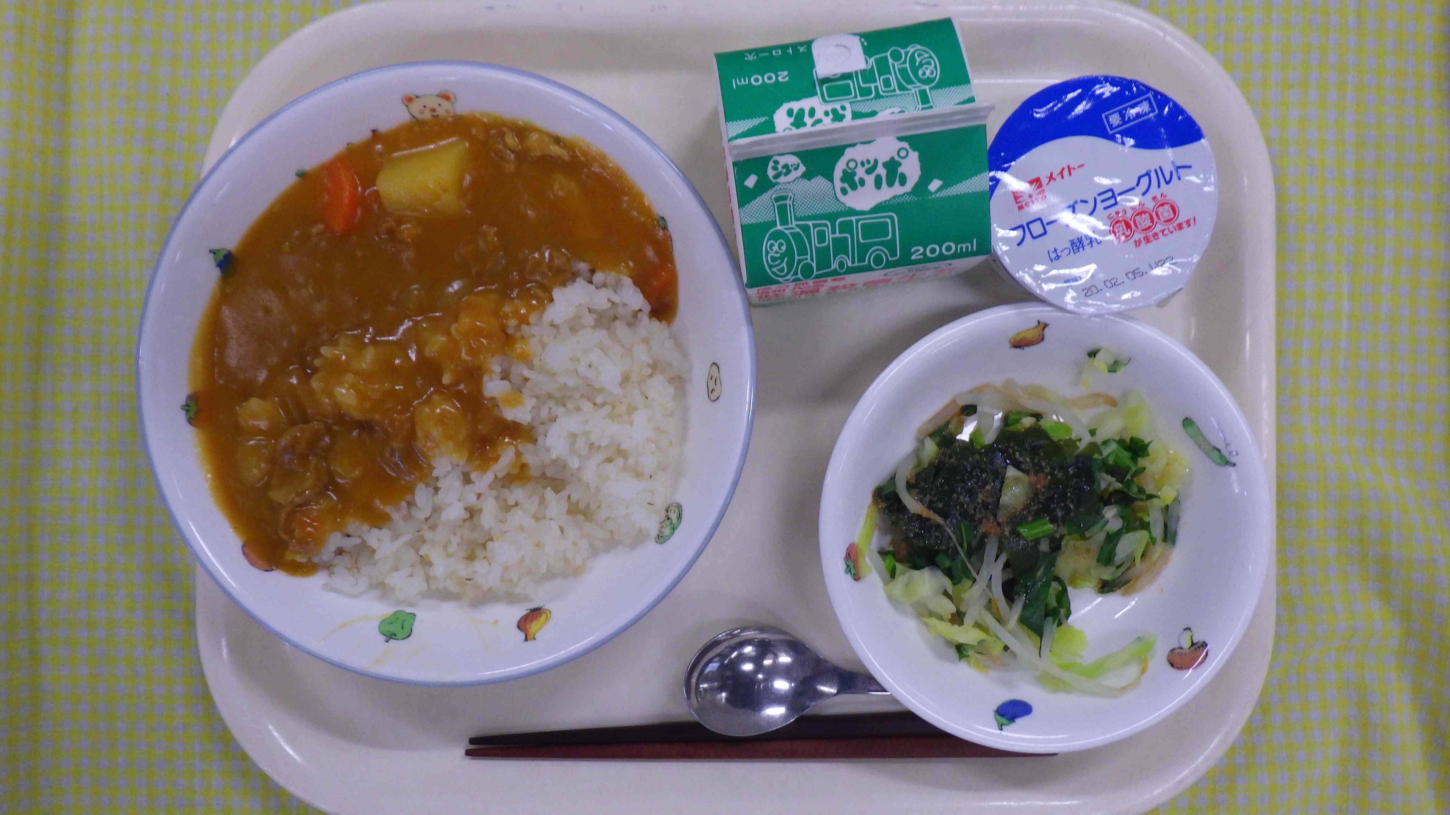 玉ねぎカレーライス ボイル野菜 韓国風ドレッシング フローズンヨーグルト 牛乳