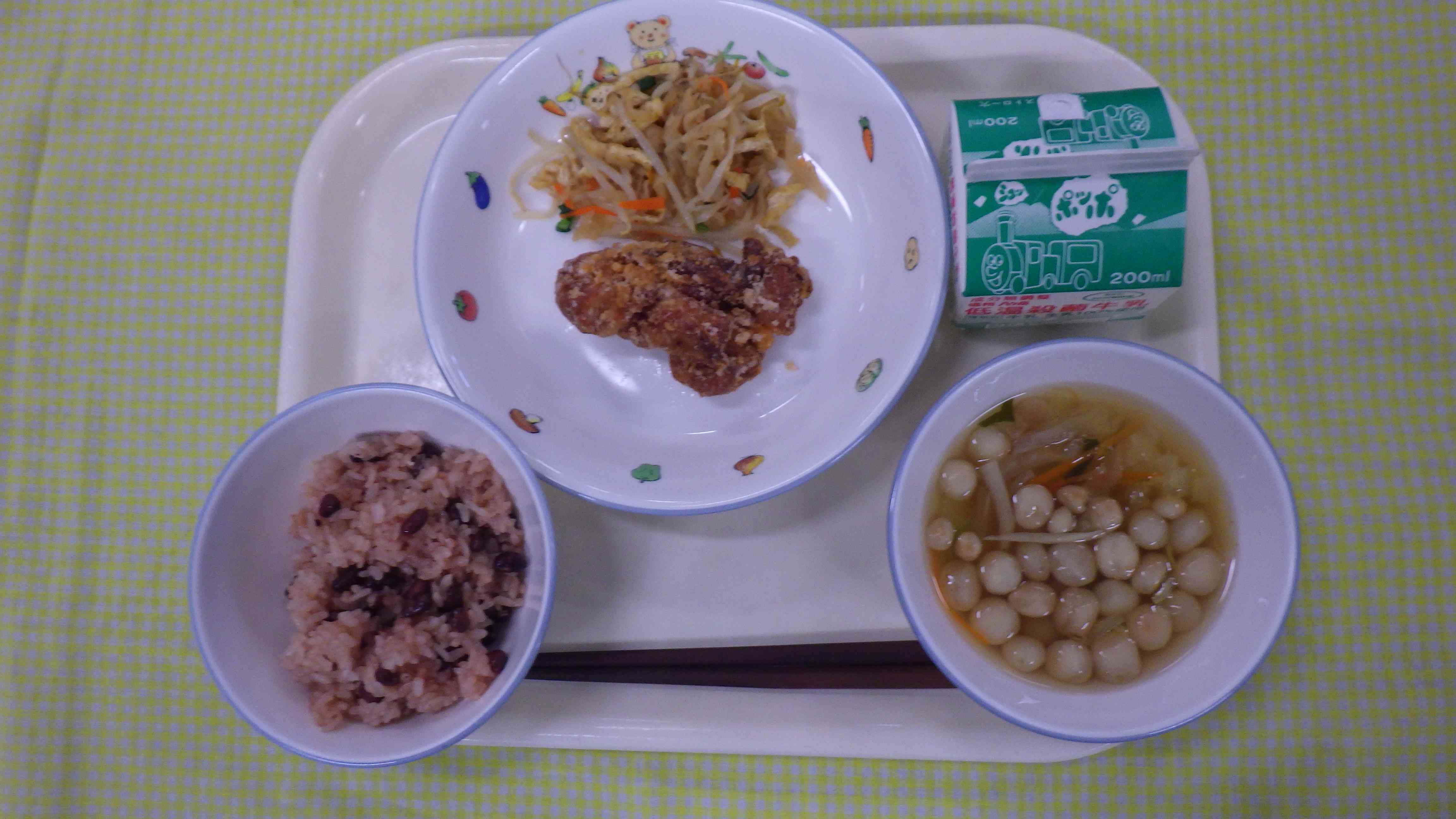 赤飯 すまし汁 鶏の立田揚げ 切り干しの温野菜 牛乳