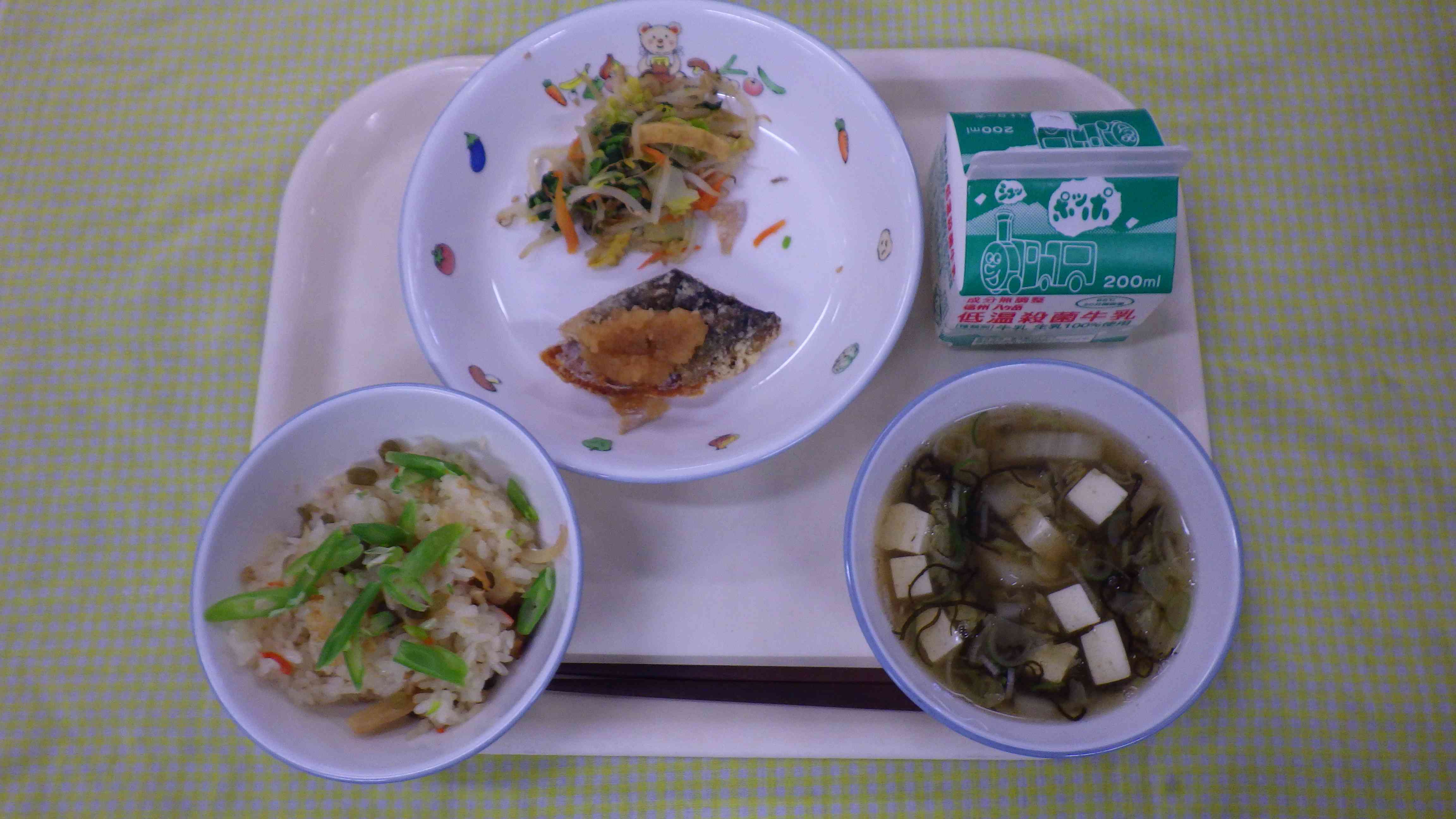 春の香りごはん すまし汁 さばのおろしソース 温野菜 牛乳