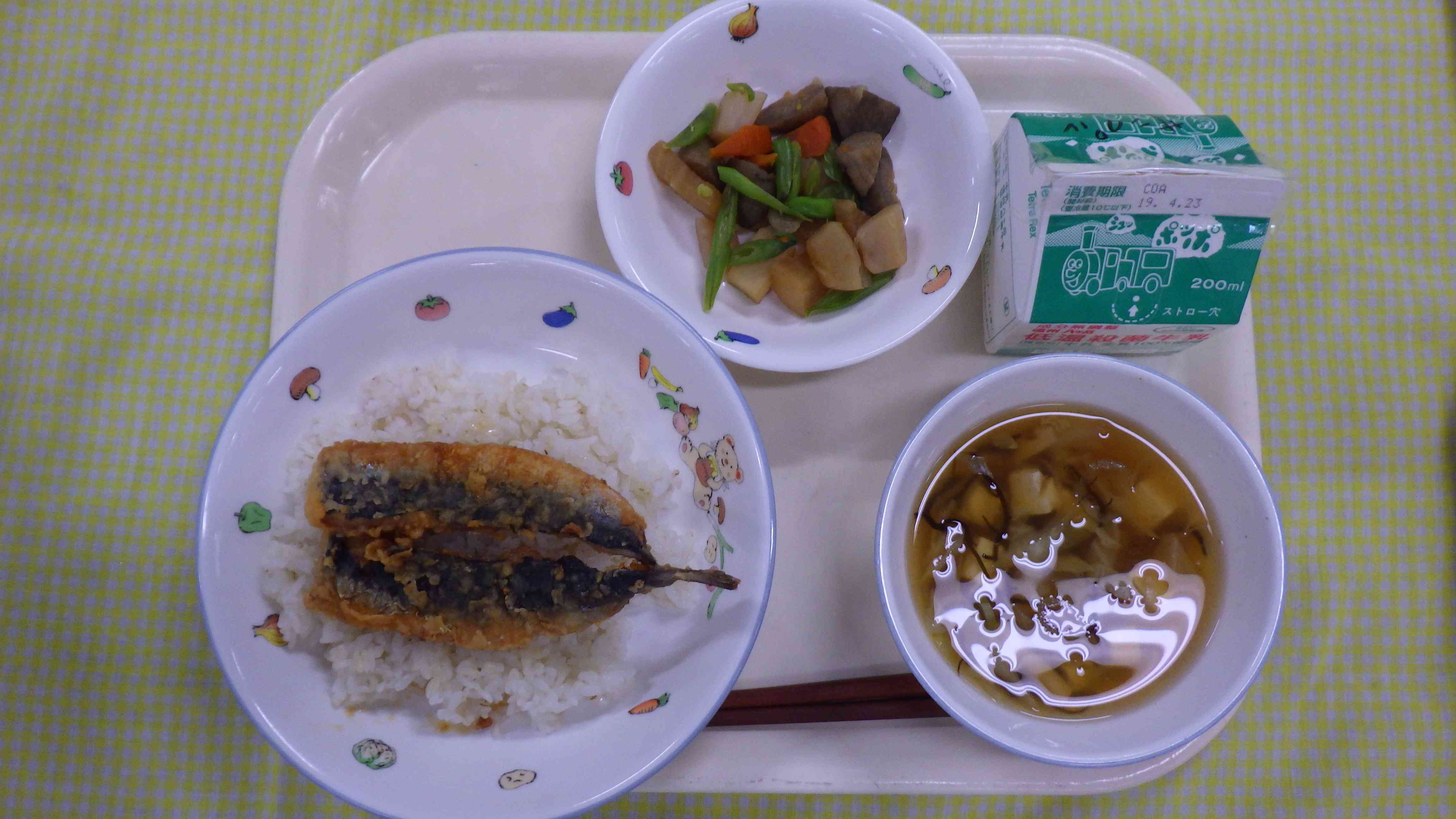 いわしのかば焼き丼 すまし汁 根菜とさつま揚げの煮物 牛乳