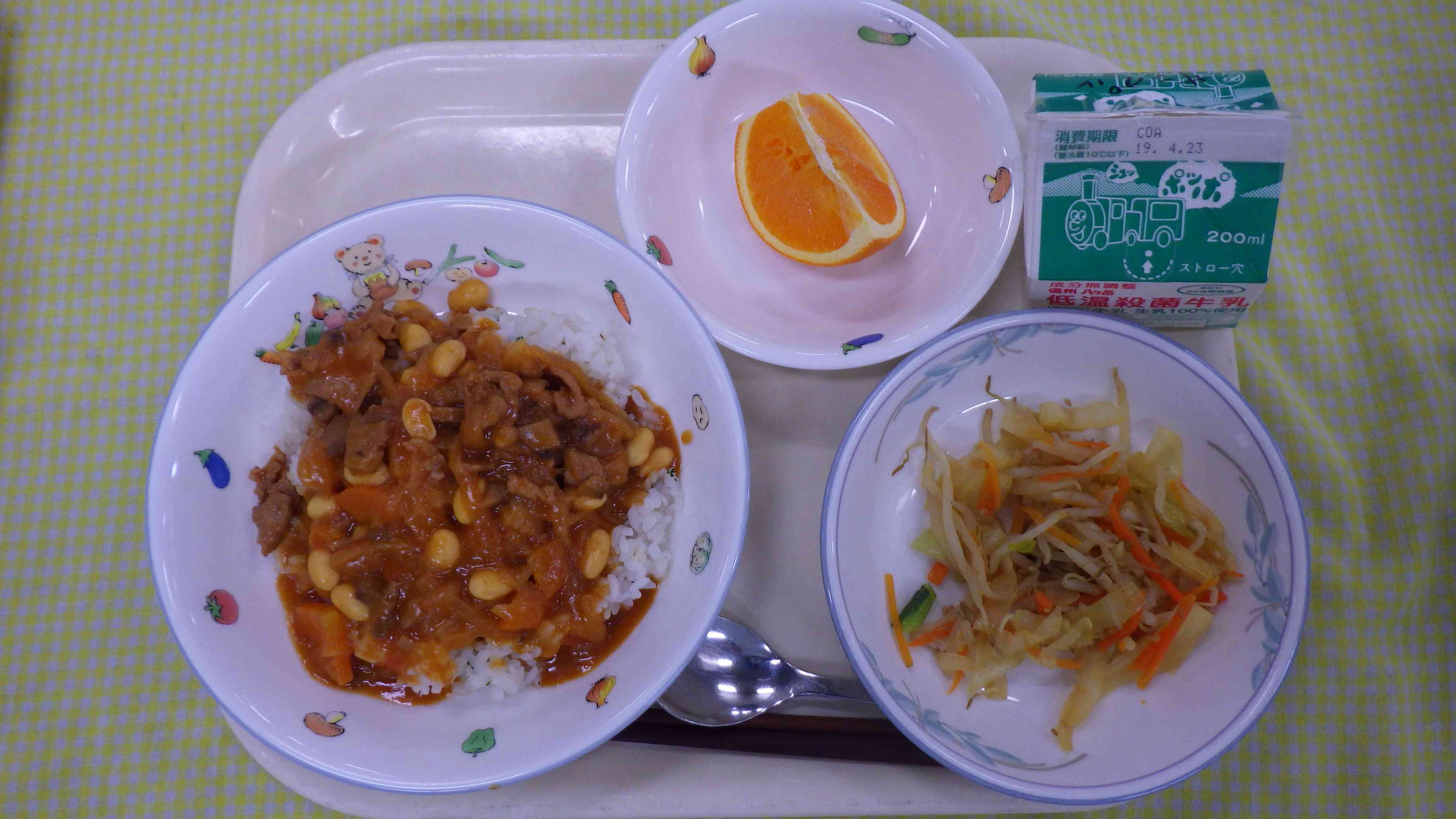 ポークビーンズライス 温サラダ 清美オレンジ 牛乳