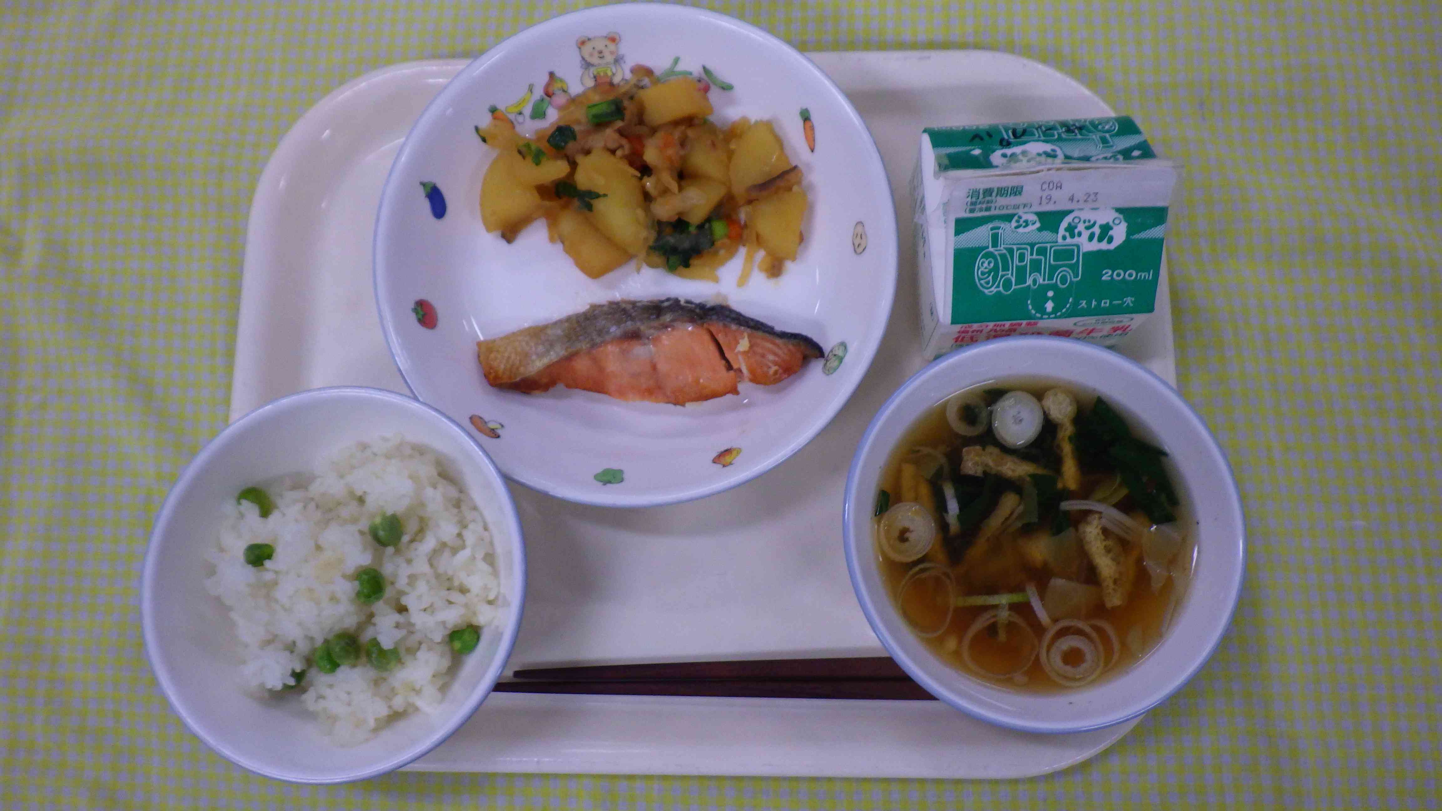 グリーンピースごはん きゃべつのみそ汁 焼き鮭 肉じゃが煮 牛乳