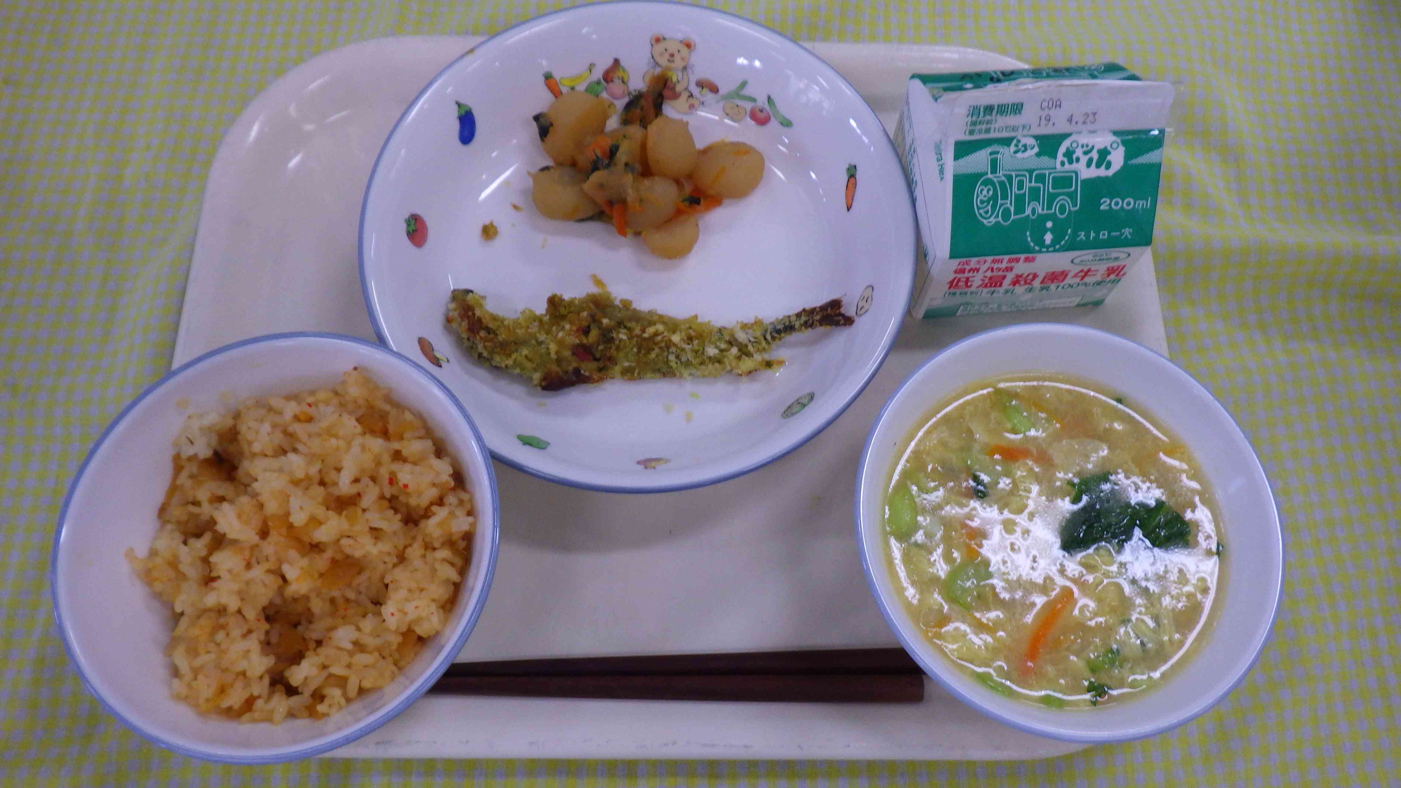 キムタクごはん 中華コーンスープ ししゃものカレーパン粉焼き こんにゃくみそ煮 牛乳