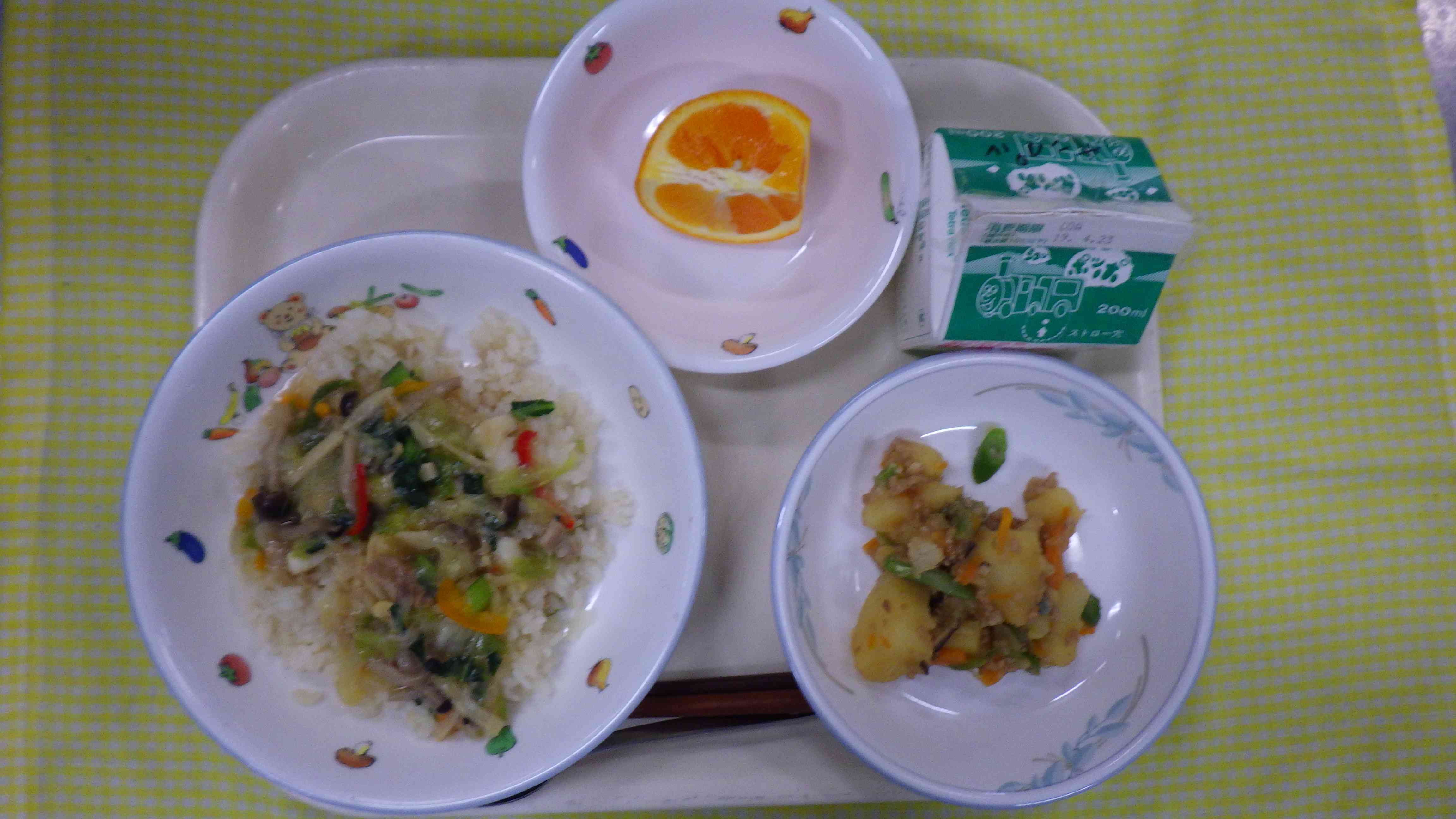 海鮮あんかけチャーハン じゃが芋のそぼろ煮 清美オレンジ 牛乳
