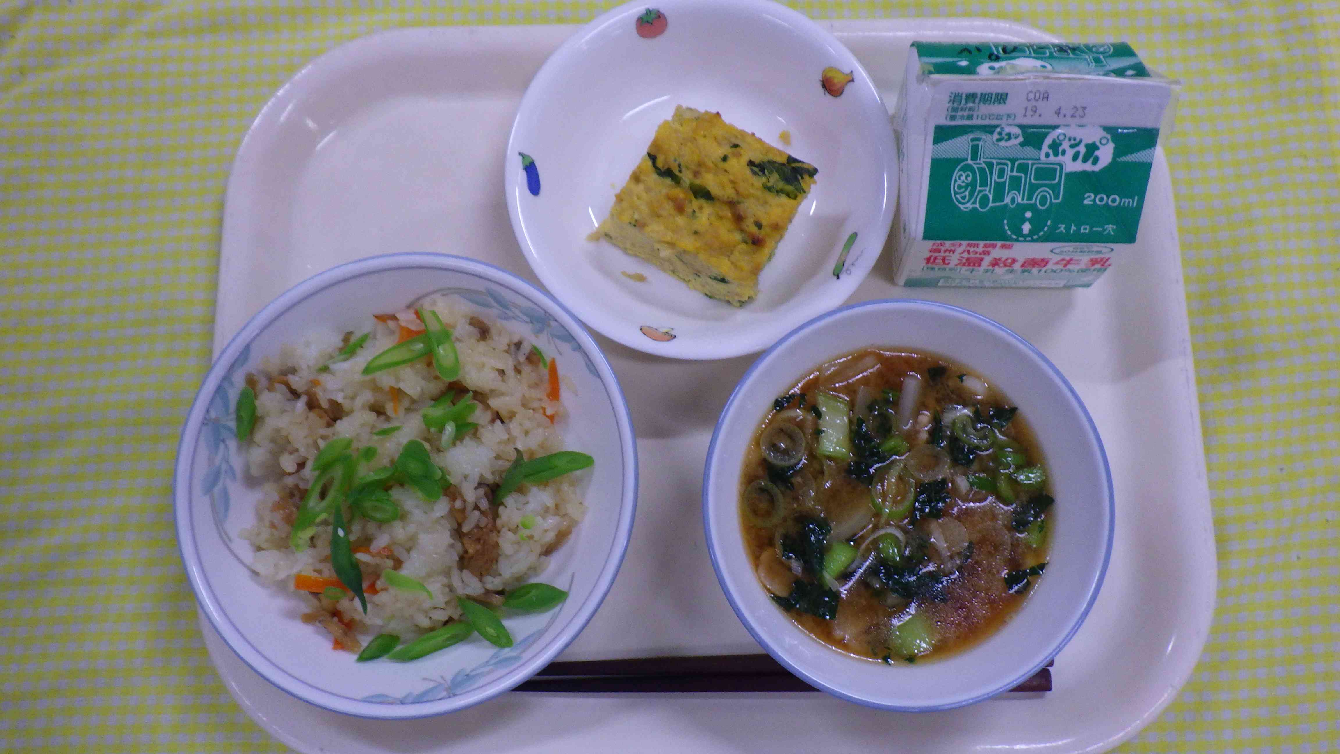 油揚げ寿司 実だくさんみそ汁 切り干し大根の厚焼き卵 牛乳