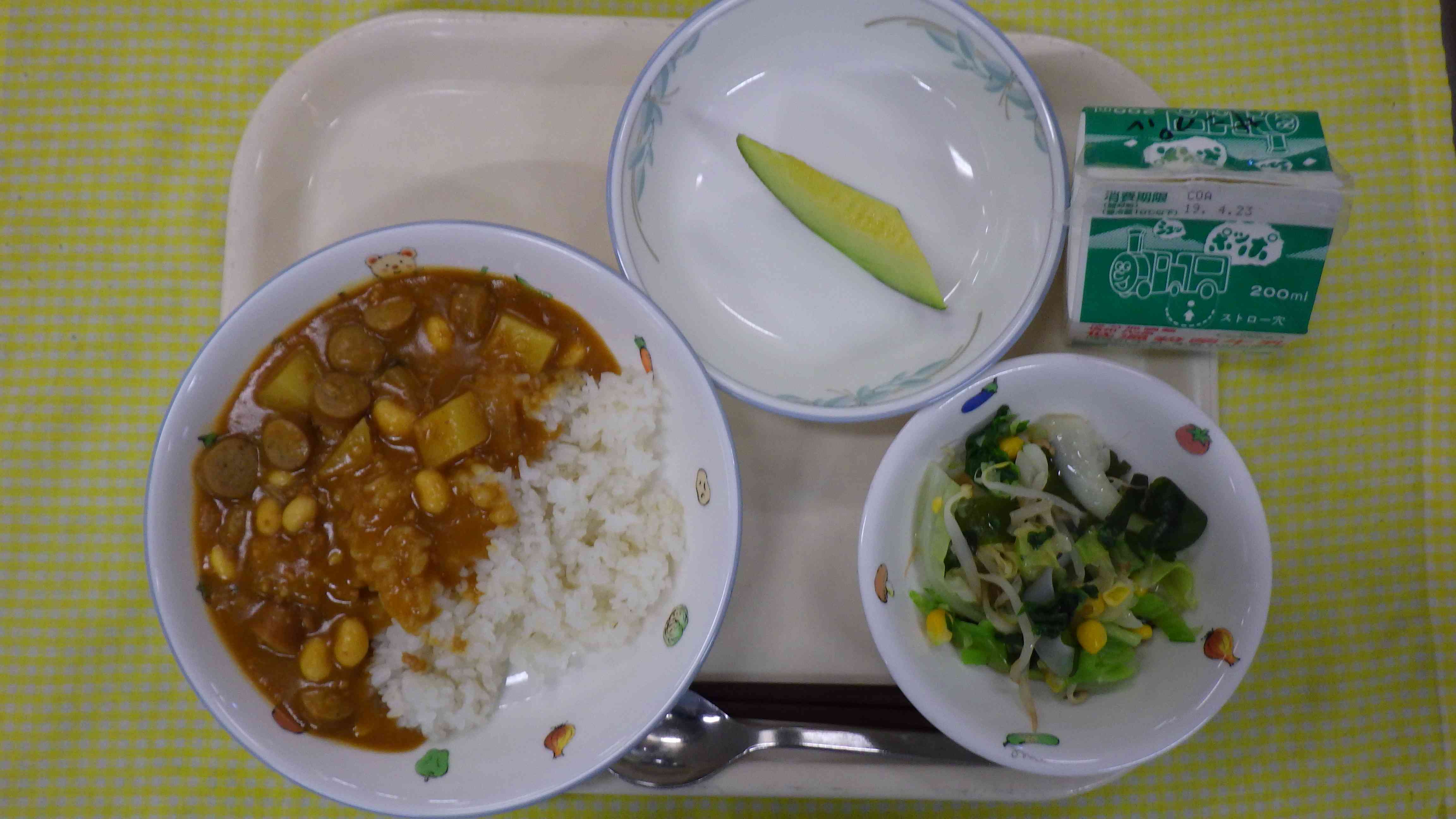 レバーソーセージカレー ボイル野菜 中華ドレッシング アンデスメロン 牛乳