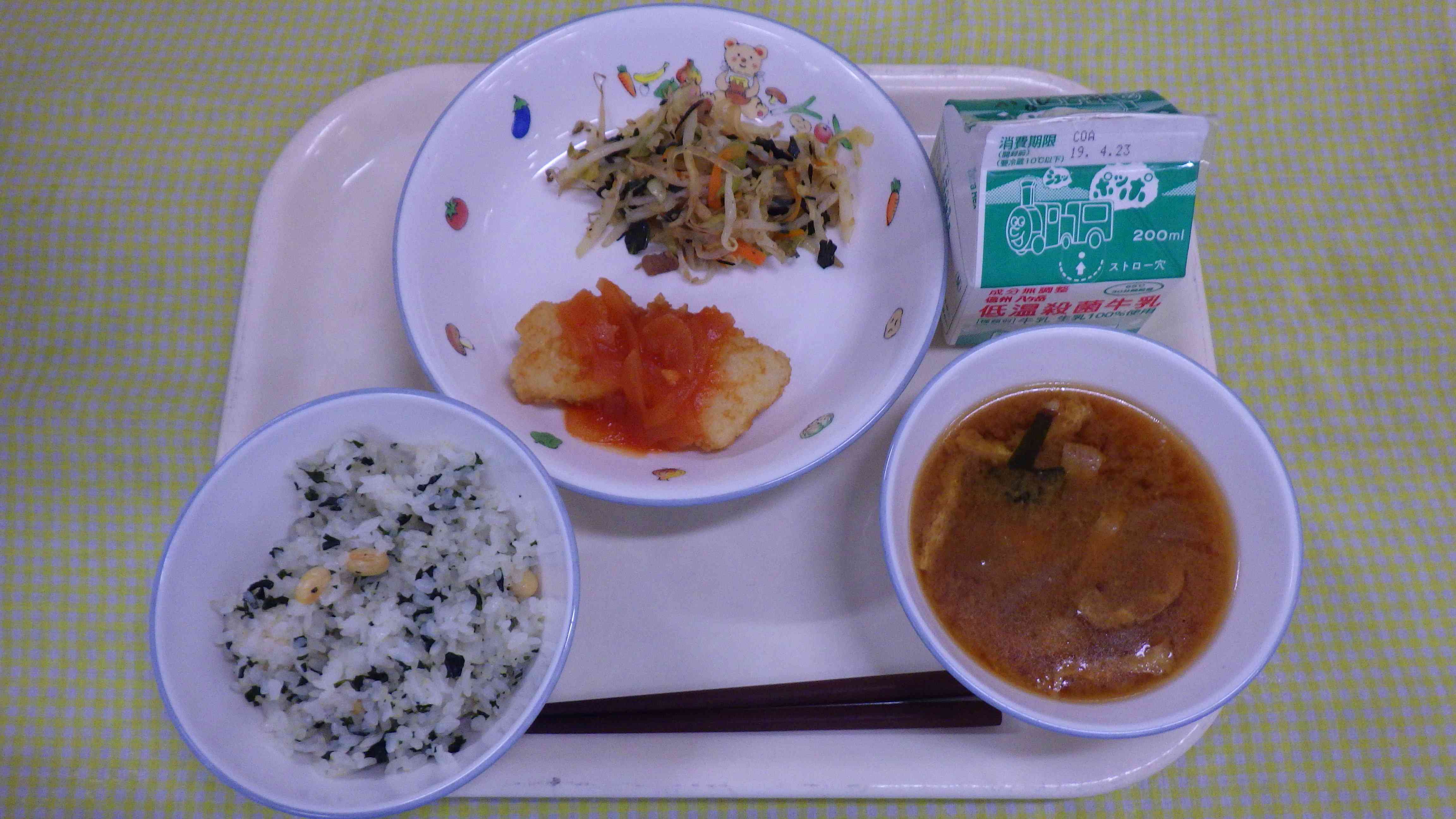 大豆のわかめのごはん みそ汁 いかのチリソース 中華温サラダ 牛乳