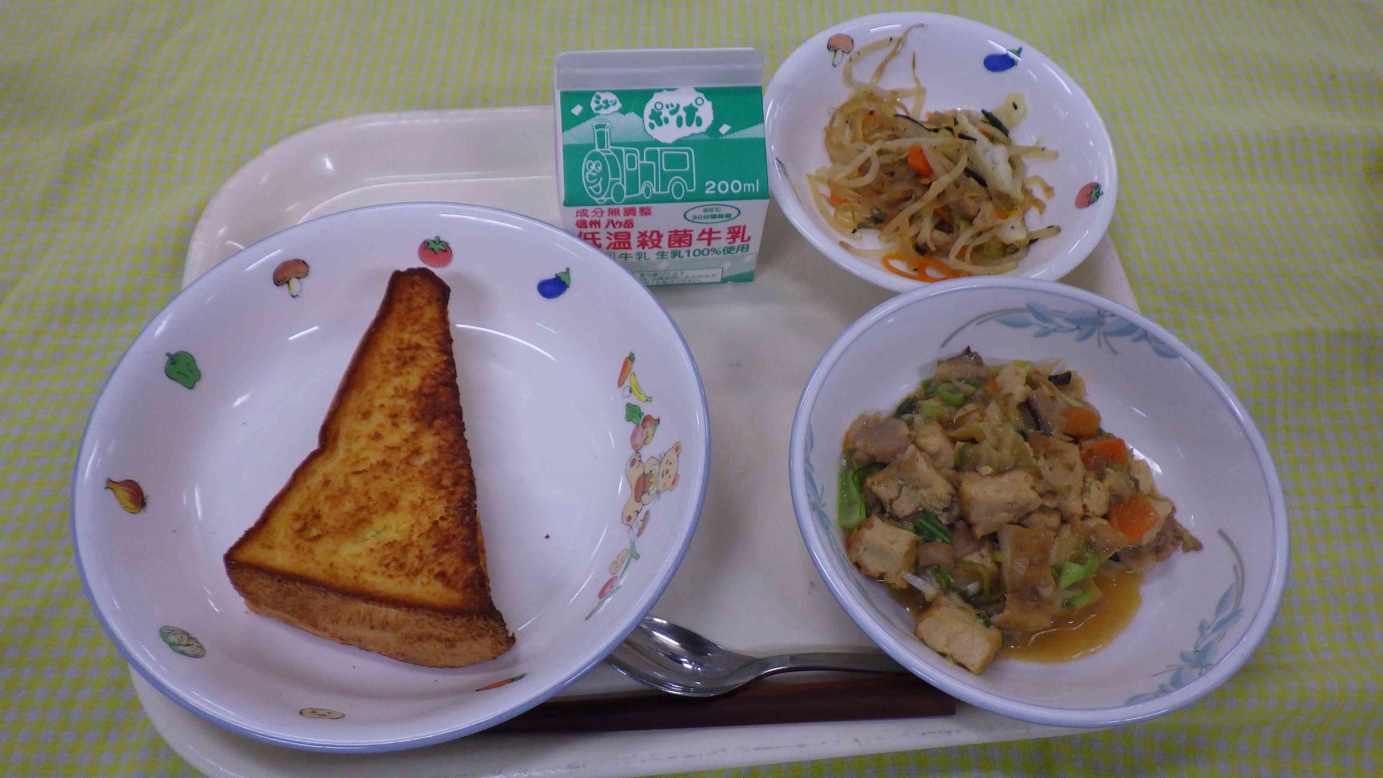 フレンチトースト 生揚げのピリ辛煮 中華温サラダ 牛乳