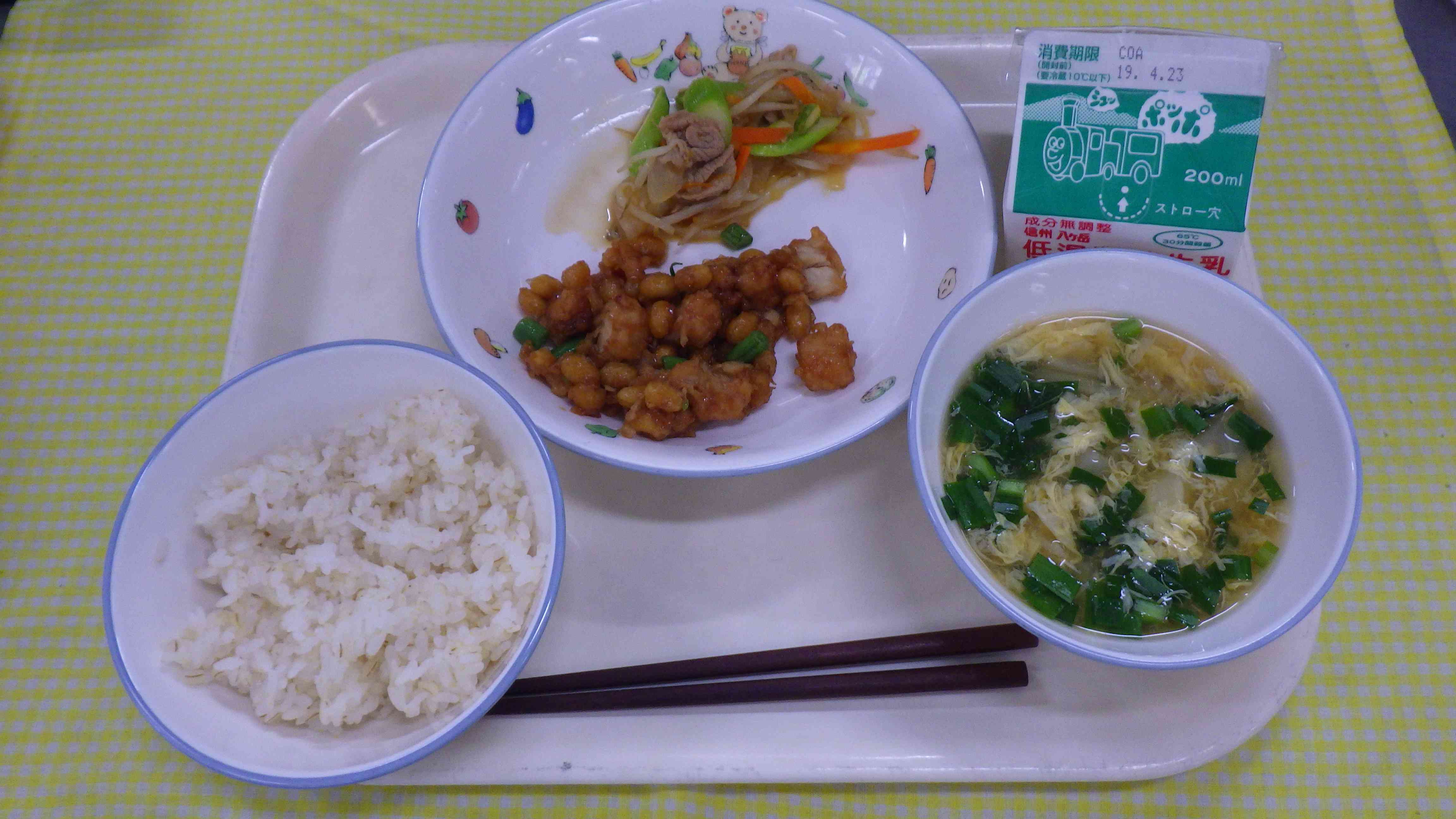 麦ごはん にら玉汁 まぐろと大豆のこはく煮 アスパラと豚肉の炒め物 牛乳