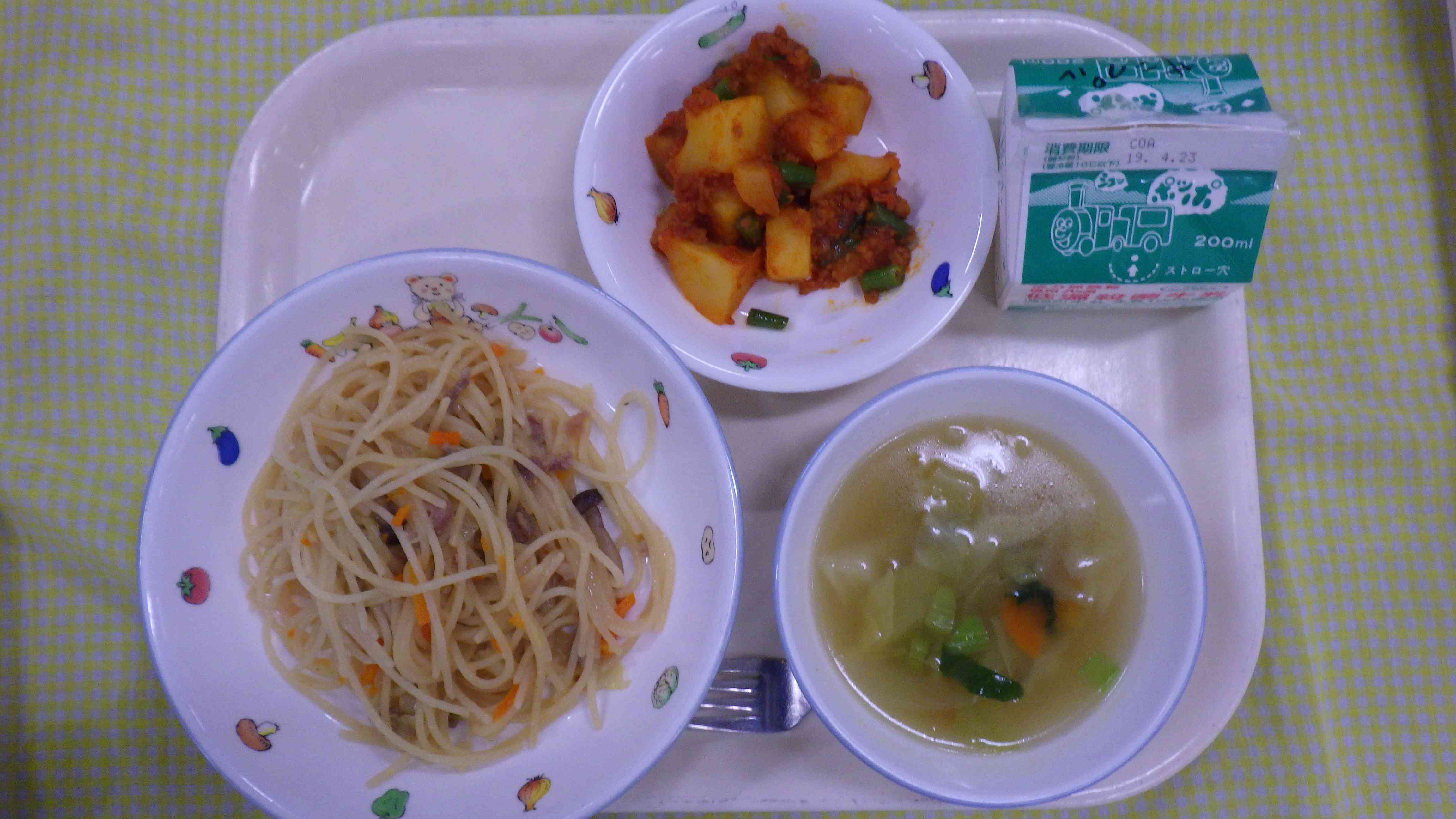 和風スパゲティ 野菜スープ ミートソースポテト 牛乳