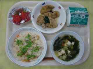 油揚げ寿司 すまし汁 がんもどきとこんにゃくの煮物 いちご 牛乳
