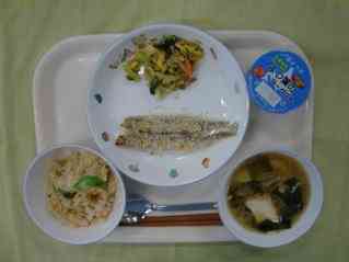春の香りごはん みそ汁 ししゃものさざれ焼き 焼き豚カレー温野菜 ヨーグルト