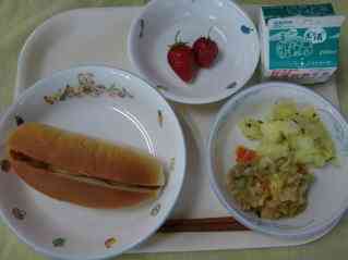 ピザサンド ポテトリヨネーズ 春きゃべつのみそ炒め いちご 牛乳