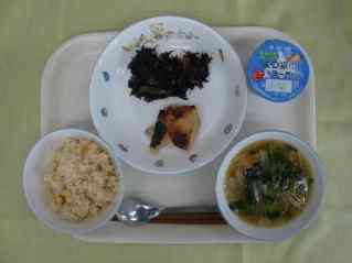 大豆ごはん じゃが芋のみそ汁 鶏の塩麹焼き ひじきの煮物 ヨーグルト