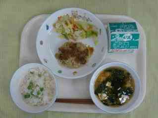 グリーンピースごはん みそ汁 焼きメンチカツ キャベツソテー 牛乳