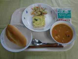 ソフトフランスパン トマトシチュー スペイン風オムレツ 野菜ソテー 牛乳