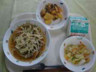 和風スープスパゲッティ じゃが芋のトマト煮 油揚げと野菜の炒め物 牛乳