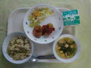 高菜チャーハン わかめスープ 豆腐ナゲット キャベツソテー 牛乳