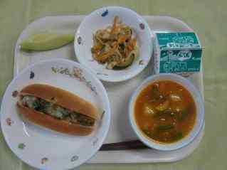 コリコリミートホットサンド トマトスープ煮 いかのバンバンジー メロン 牛乳